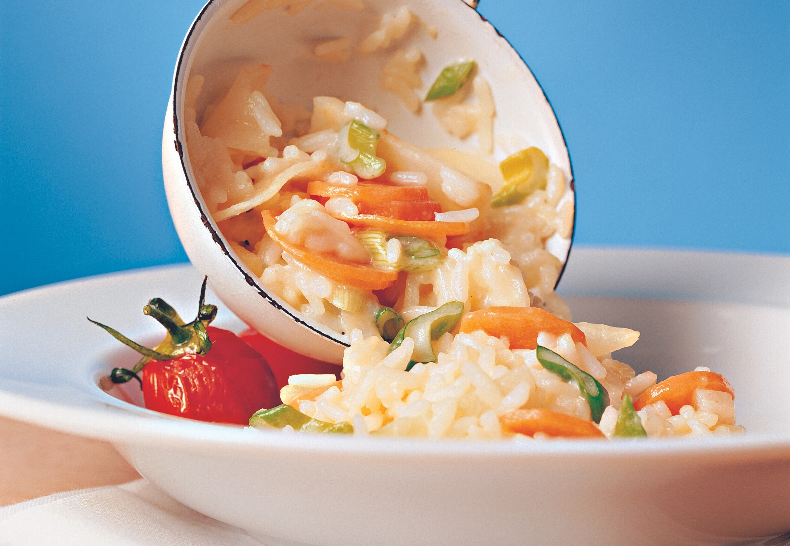 - Jungzwiebeln putzen. Sellerie, Kohlrabi und Karotten schälen. Jungzwiebel und Karotten in 1/2 cm dicke Scheiben schneiden. Sellerie und Kohlrabi in 2 cm große Würfel schneiden und mit dem übrigen Gemüse in der Butter anschwitzen. Reis und Lorbeer unterrühren, mit 400 ml Wasser aufgießen und salzen. Reis aufkochen und bei schwacher Hitze zugedeckt ca. 20 Minuten bissfest dünsten. Dabei öfters umrühren.