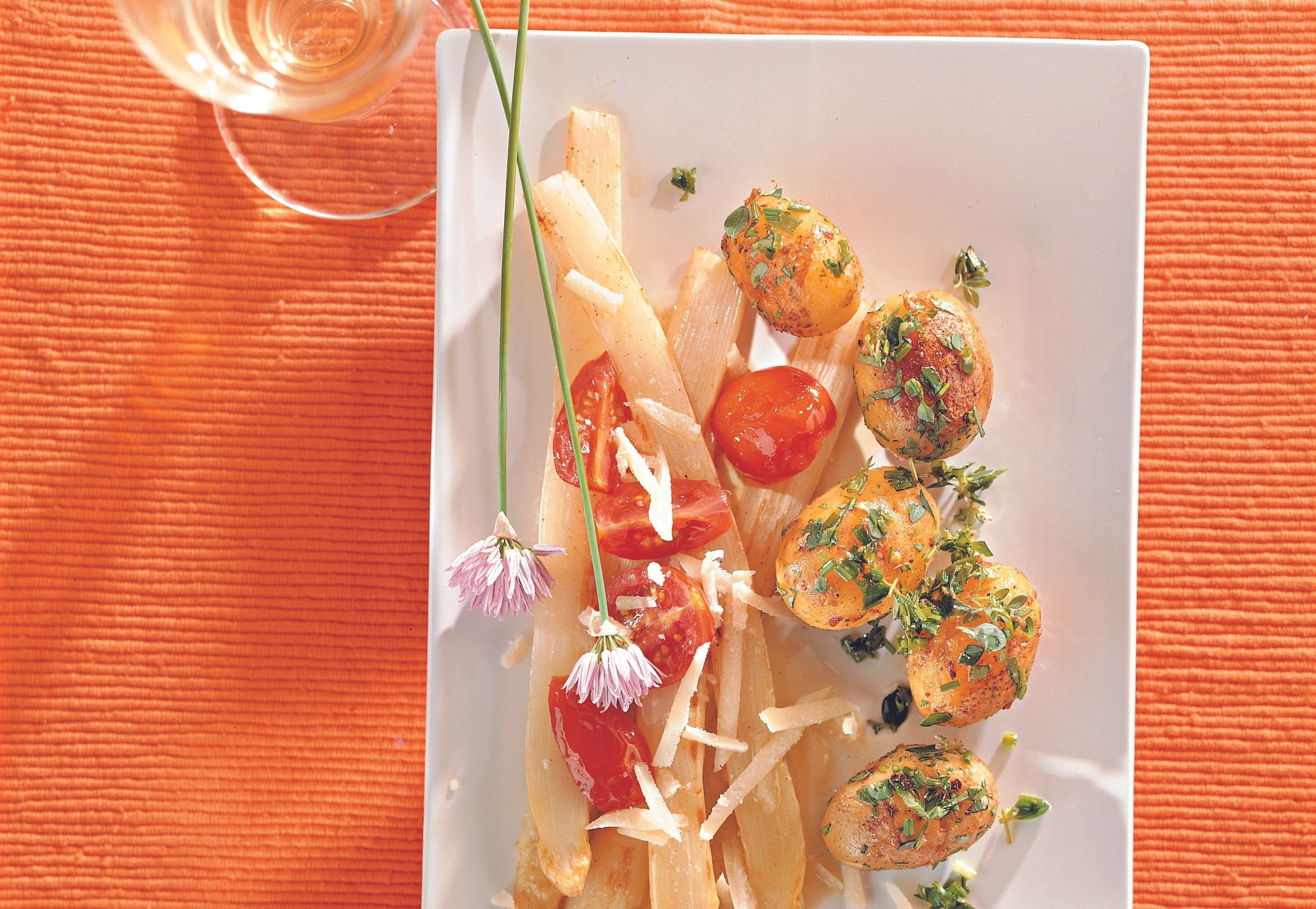 Spargel mit Kirschparadeisern und Heurigen anrichten, mit Parmesan bestreuen.