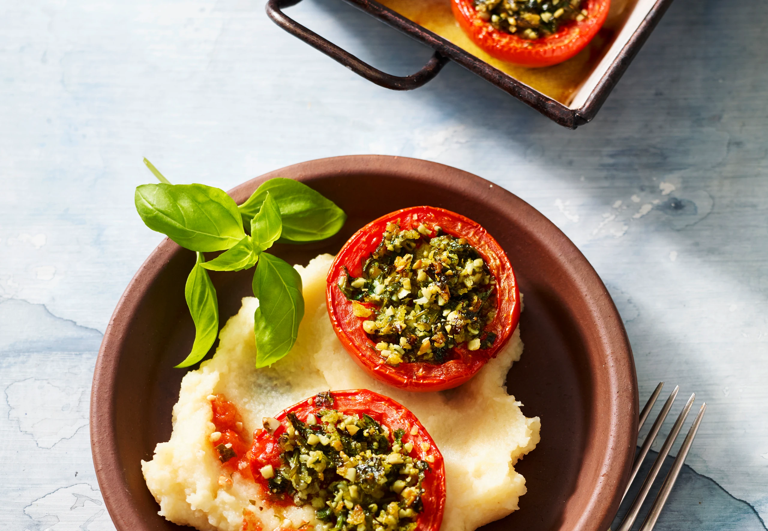 Paradeiser mit der Mischung füllen, in eine Auflaufform setzen und im Rohr (mittlere Schiene / Gitterrost) ca. 20 Minuten garen. Paradeiser auf dem Selleriepüree anrichten.