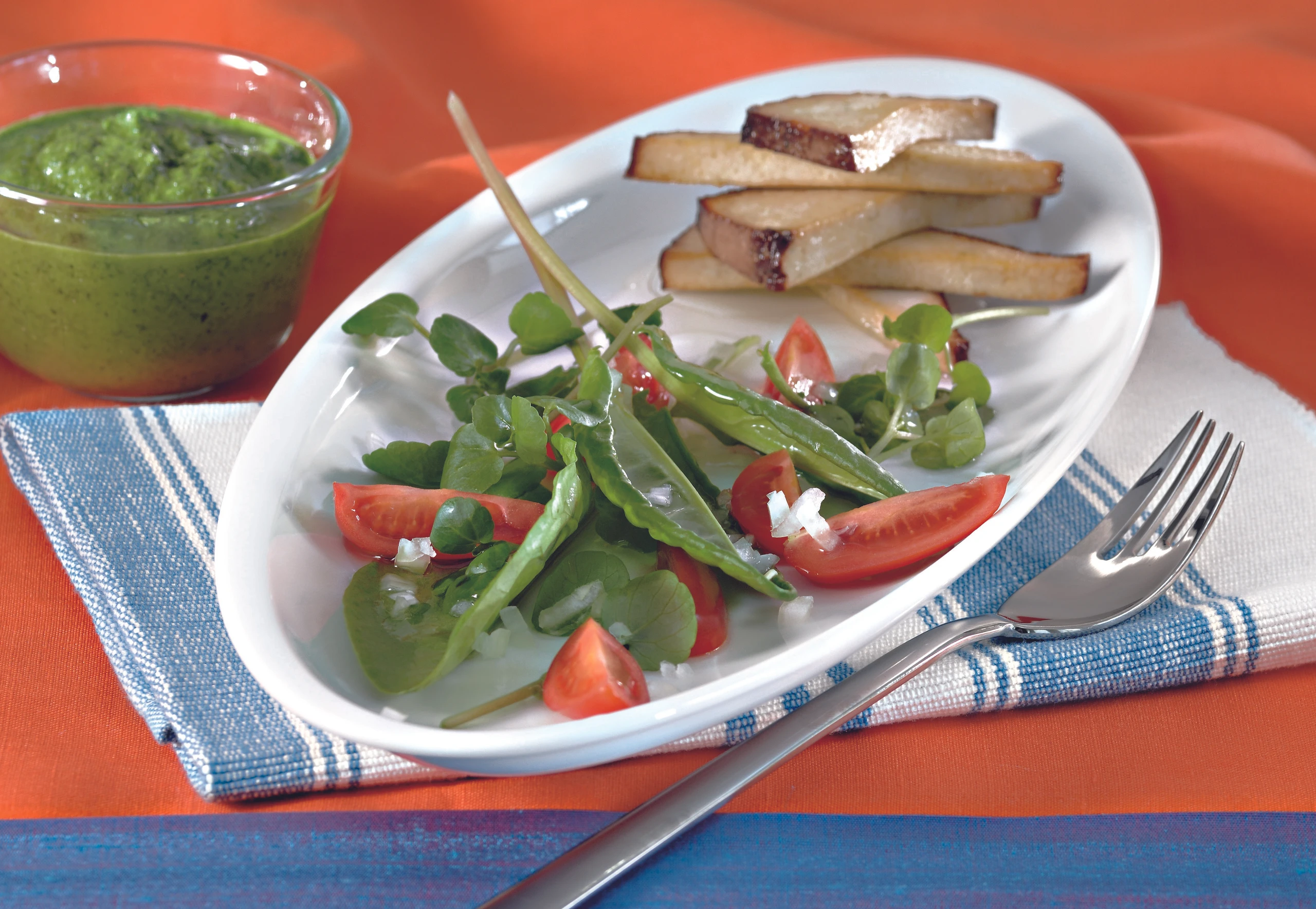 Kräuter-Salat mit dem gebratenen Tofu anrichten. Salsa verde dazu reichen.