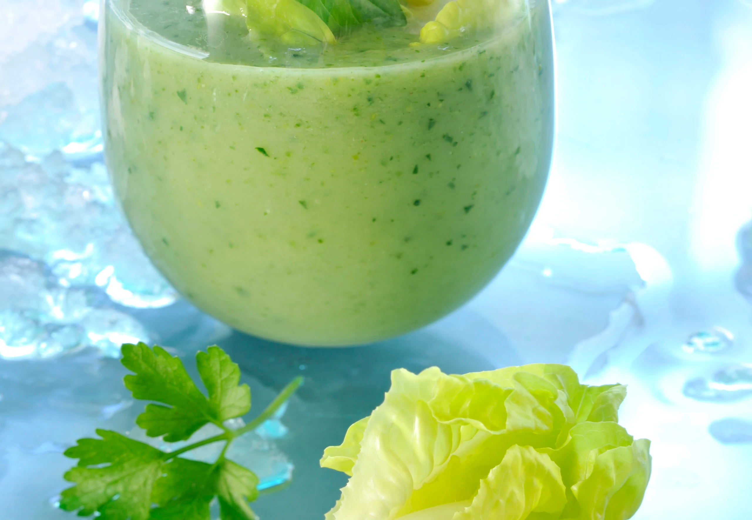 - Mit dem Pürierstab die kalte Suppe mit Salat, Petersilie, Basilikum und Joghurt fein pürieren, mit Salz und Pfeffer abschmecken.