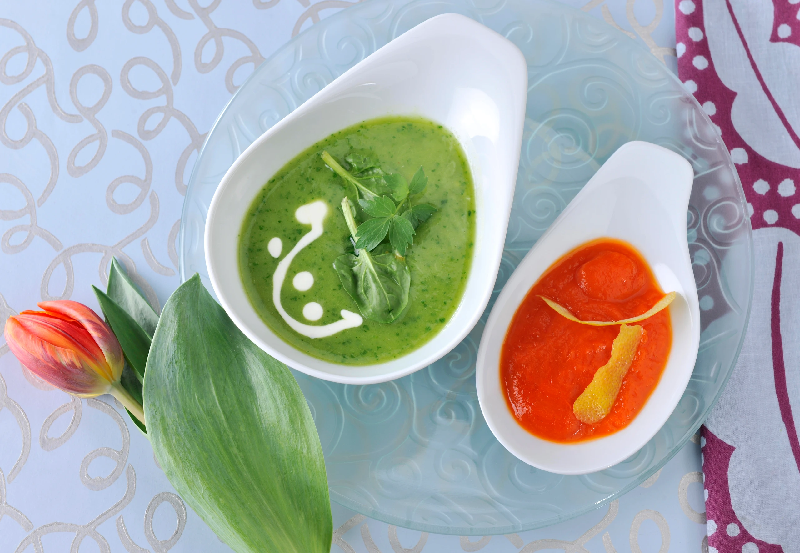 Suppe mit Joghurt garniert anrichten und mit dem Dip servieren.