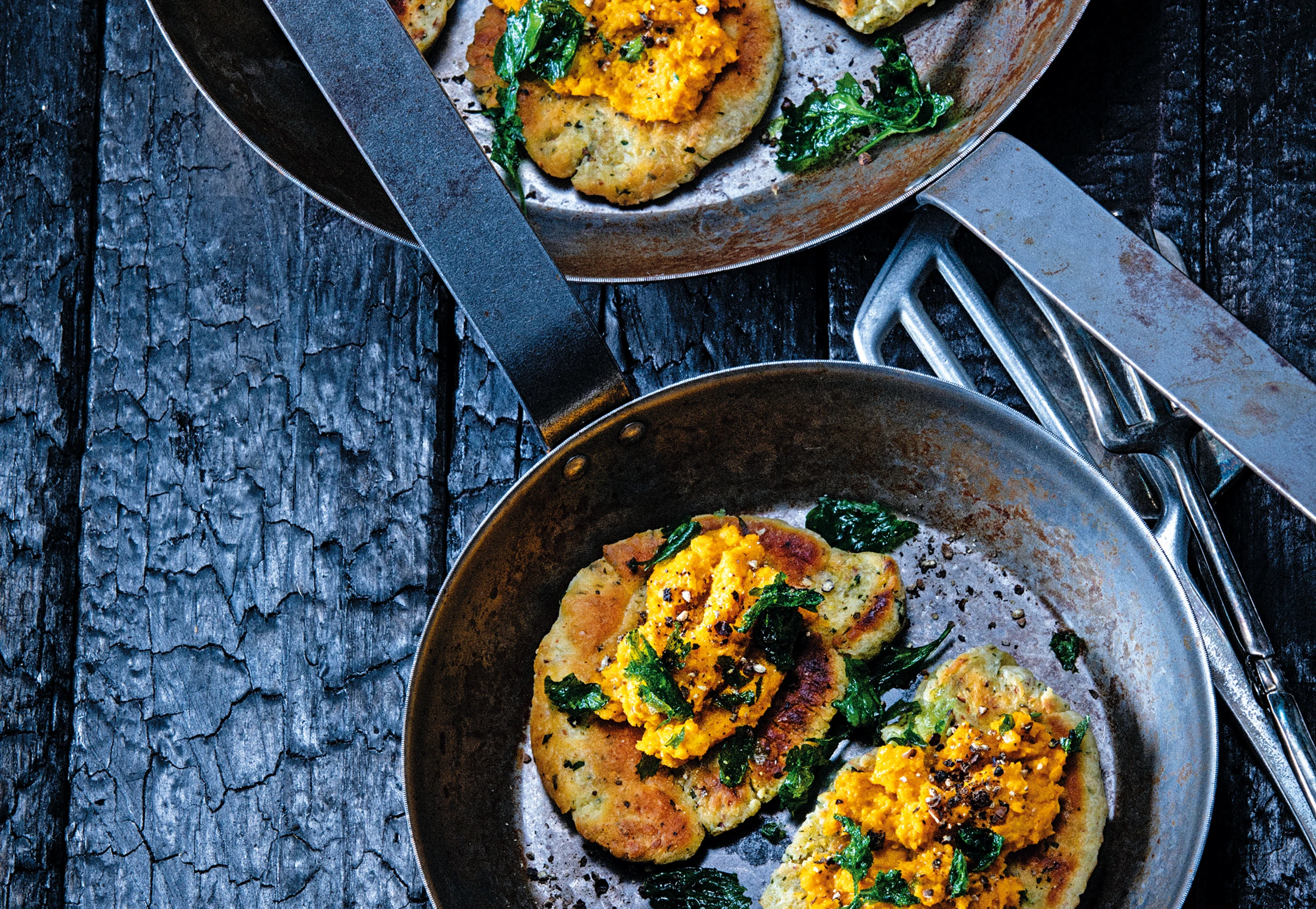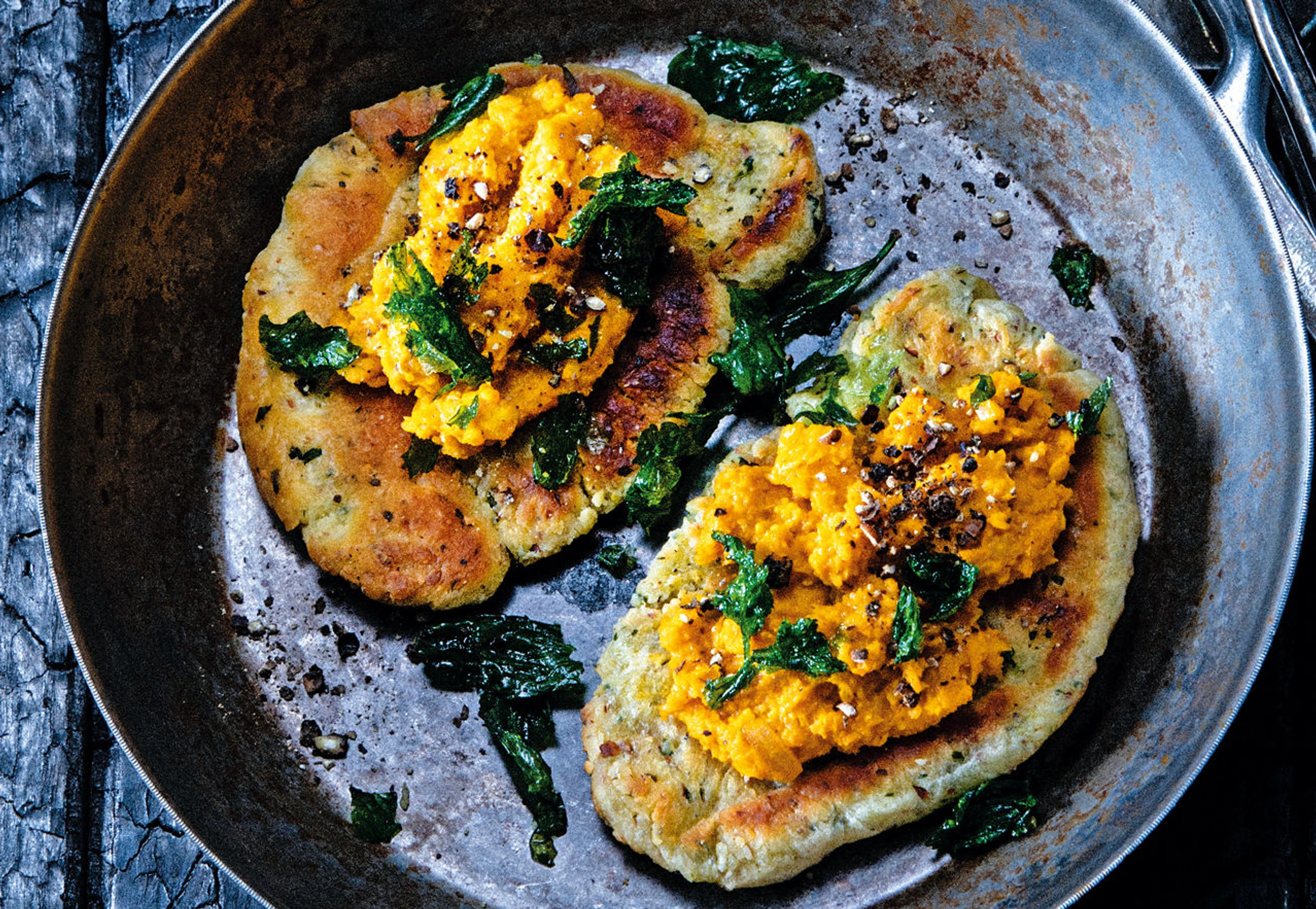 Rohr auf 50°C vorheizen. Teig in 12 Portionen teilen und auf einer mit wenig Mehl bestreuten Arbeitsfläche ca. 0,5 cm dick ausrollen. In einer Pfanne wenig Öl erhitzen und die Fladen darin nacheinander beidseitig braten. Fertige Fladen im Rohr warm stellen. Hummus auf den Fladen verteilen, mit grobem Pfeffer bestreuen und mit den gebackenen Kräutern garnieren.