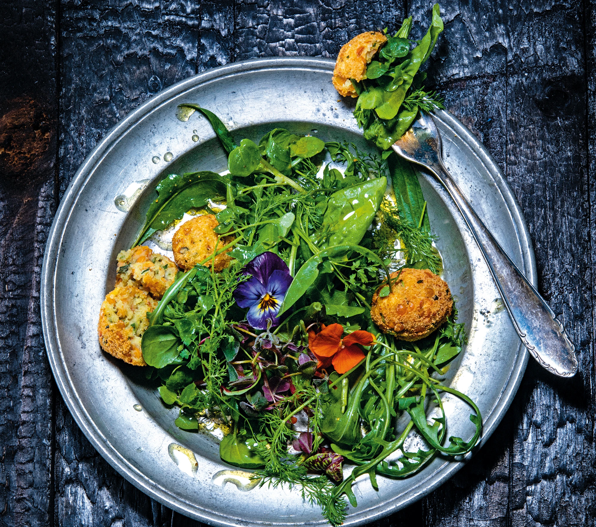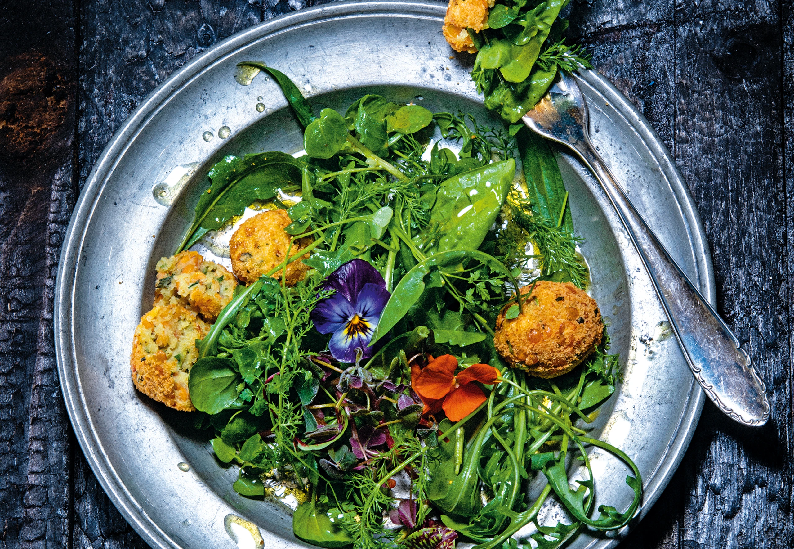 Kräutersalat mit Erdäpfel-Linsenbällchen
