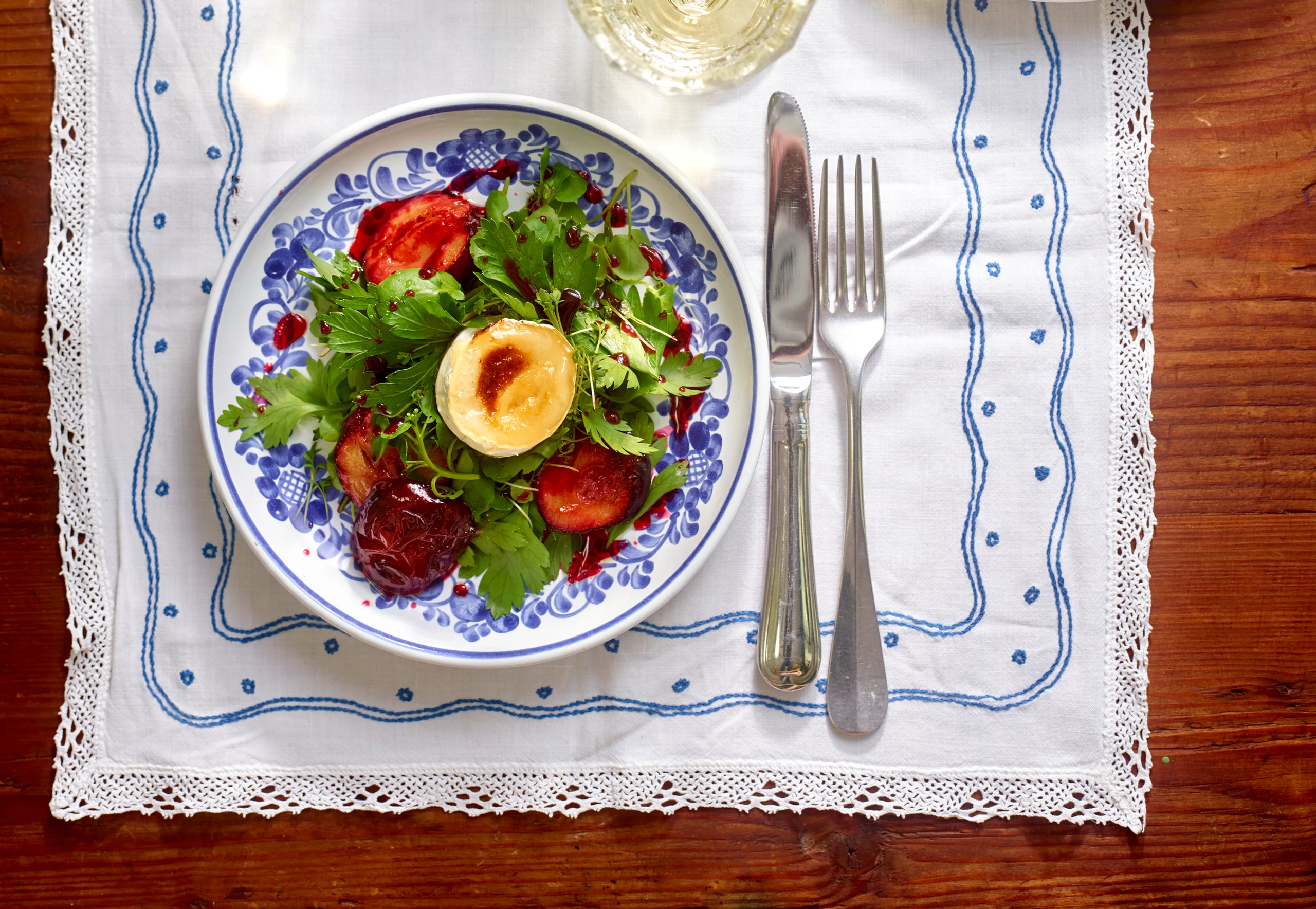 Kräutersalat mit Honigzwetschken und Ziegenkäse