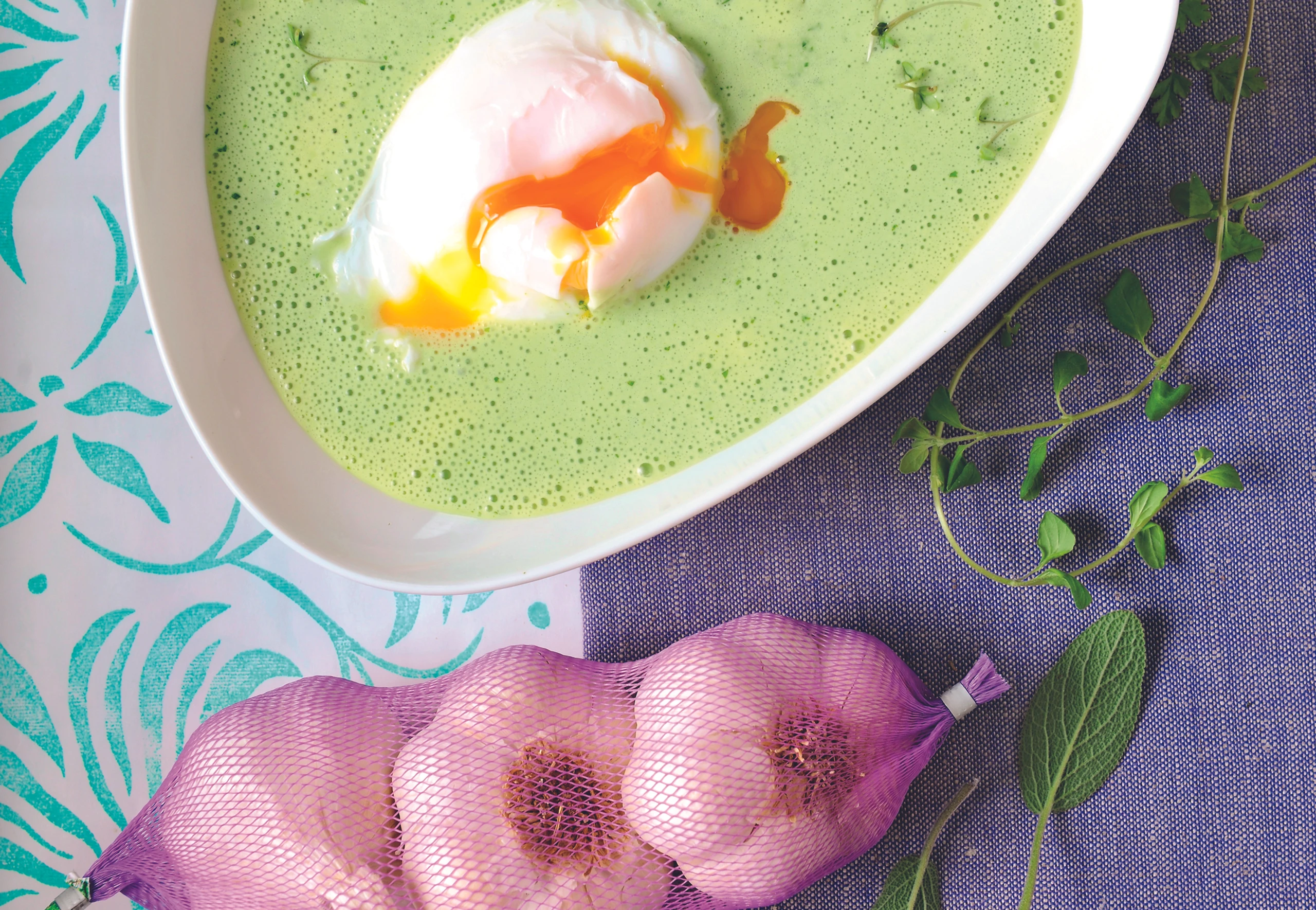 Für die Einlage 2 l Wasser mit 2 EL Essig aufkochen. Die Eier einzeln in eine Tasse schlagen und nacheinander ins Wasser gleiten lassen. Eier 3,5 – 4 Minuten garen, mit einem Schaumlöffel vorsichtig aus dem Wasser heben, auf Küchenpapier abtropfen lassen. Pochierte Eier in der Suppe anrichten.