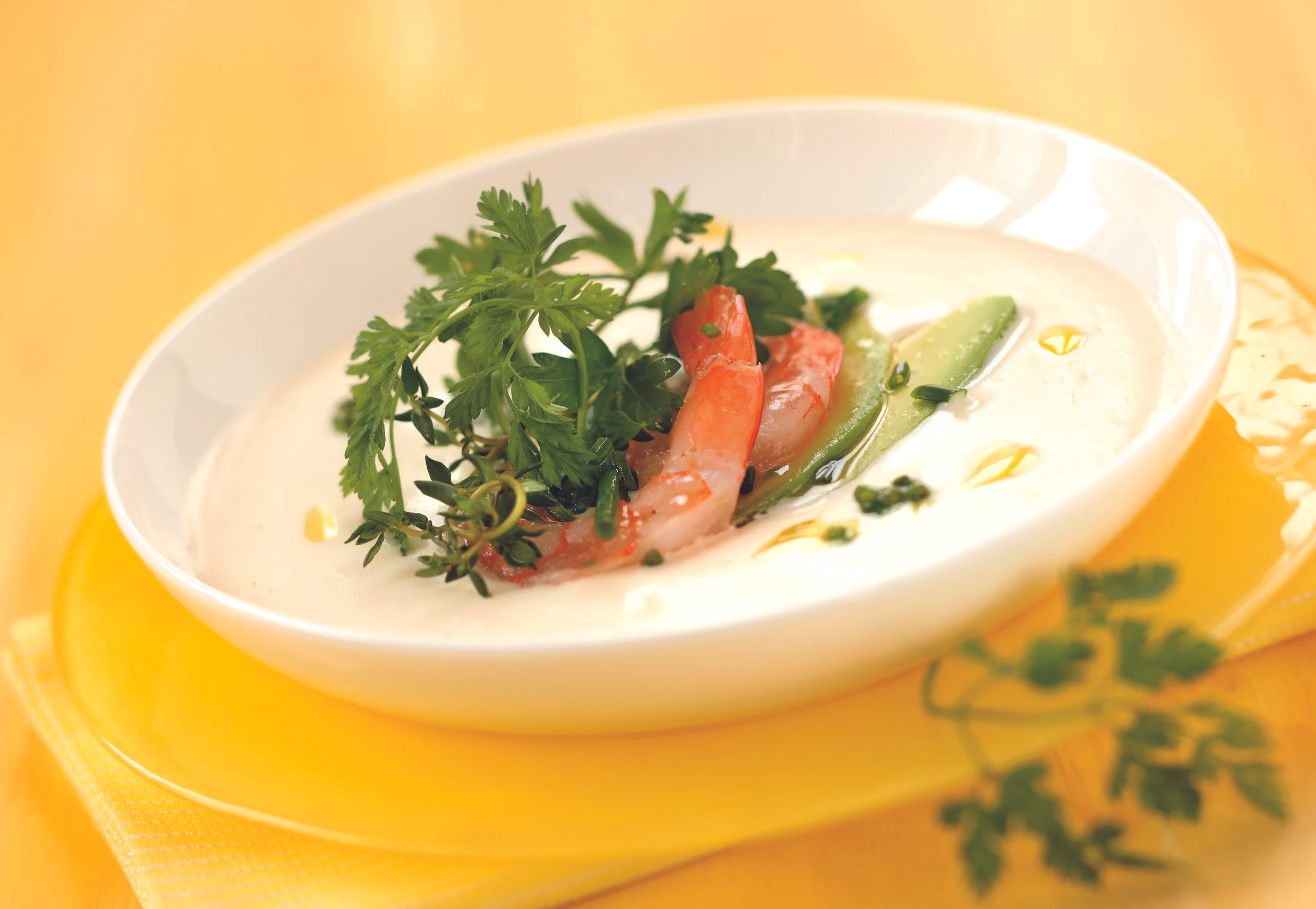 - Petersilie, Kerbel und Thymian in die Suppe rühren, Suppe mit einem Stabmixer aufschlagen. Avocadoscheiben und Garnelen in vorgewärmten Tellern anrichten, Suppe zugießen, mit Kräutern garniert servieren.