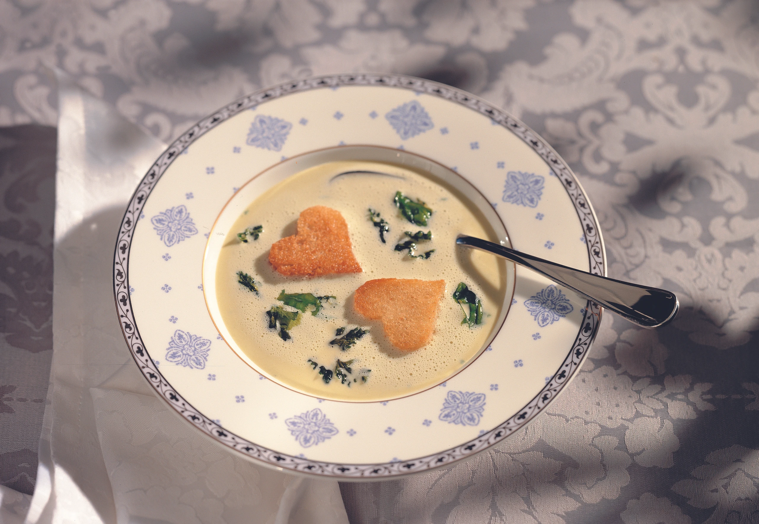 Kräuterblättchen abzupfen (ergibt ca. 50 g), grob hacken, in die Suppe geben und mit einem Stabmixer fein pürieren. Suppe durch ein Sieb gießen, mit Salz, Pfeffer und geriebener Muskatnuss würzen und nochmals aufkochen. Suppe in vorgewärmte Teller schöpfen, mit Brotherzen und gebackener Petersilie (siehe Rezept) garniert servieren.