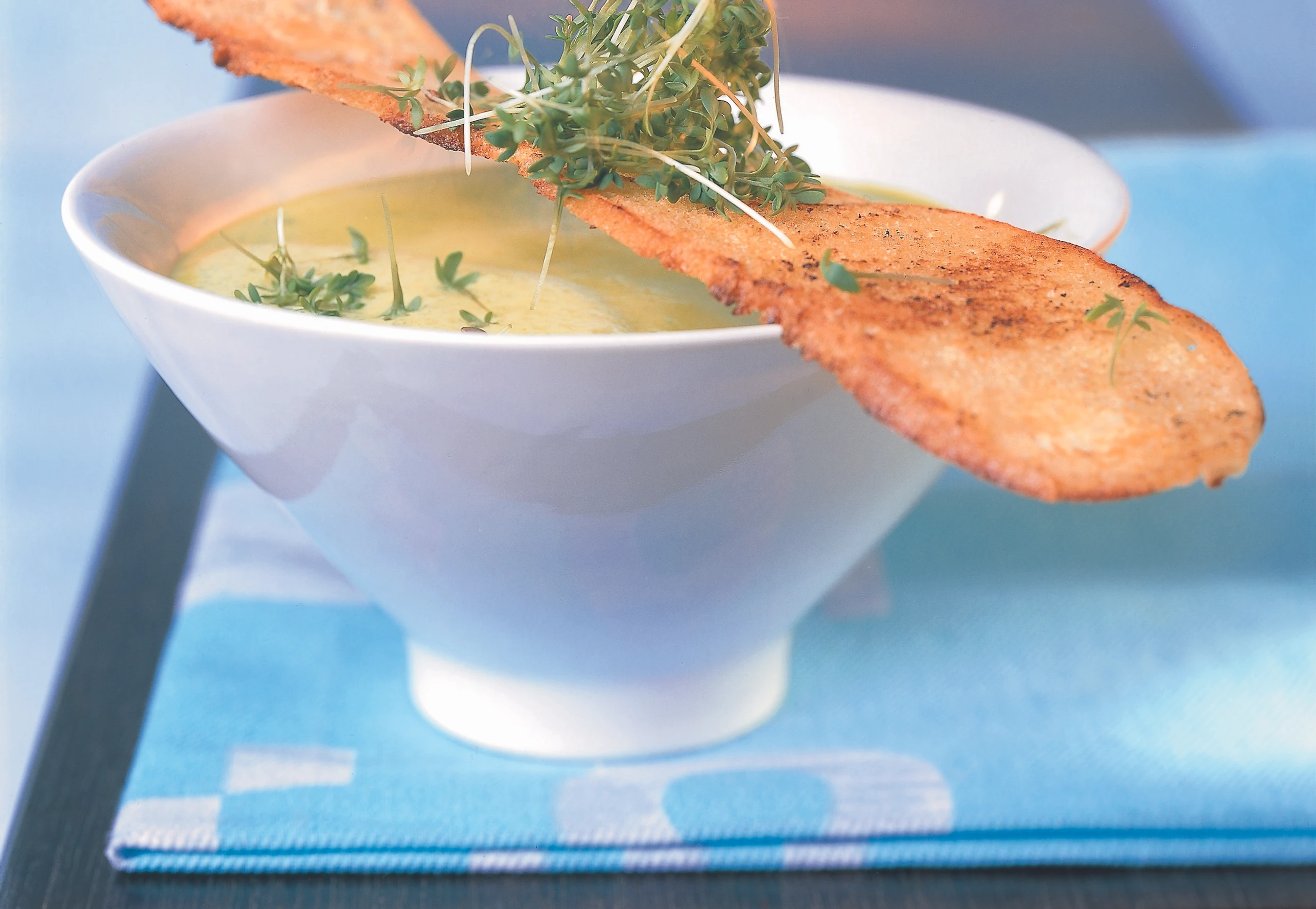 - Suppe in Tellern anrichten, mit Gartenkresse bestreuen und mit dem Knusperbrot servieren.