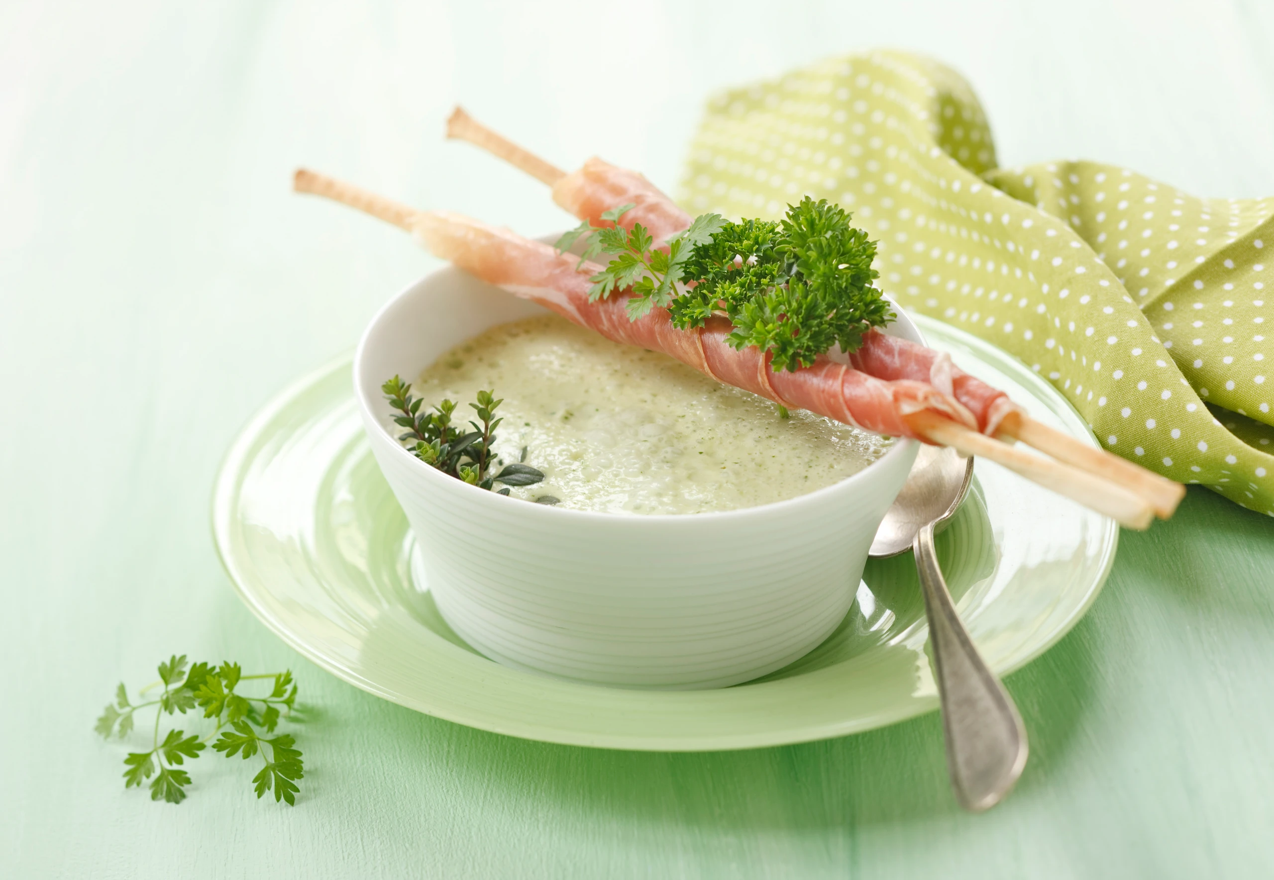 Schnelle Kräutersuppe mit Rohschinken-Grissini