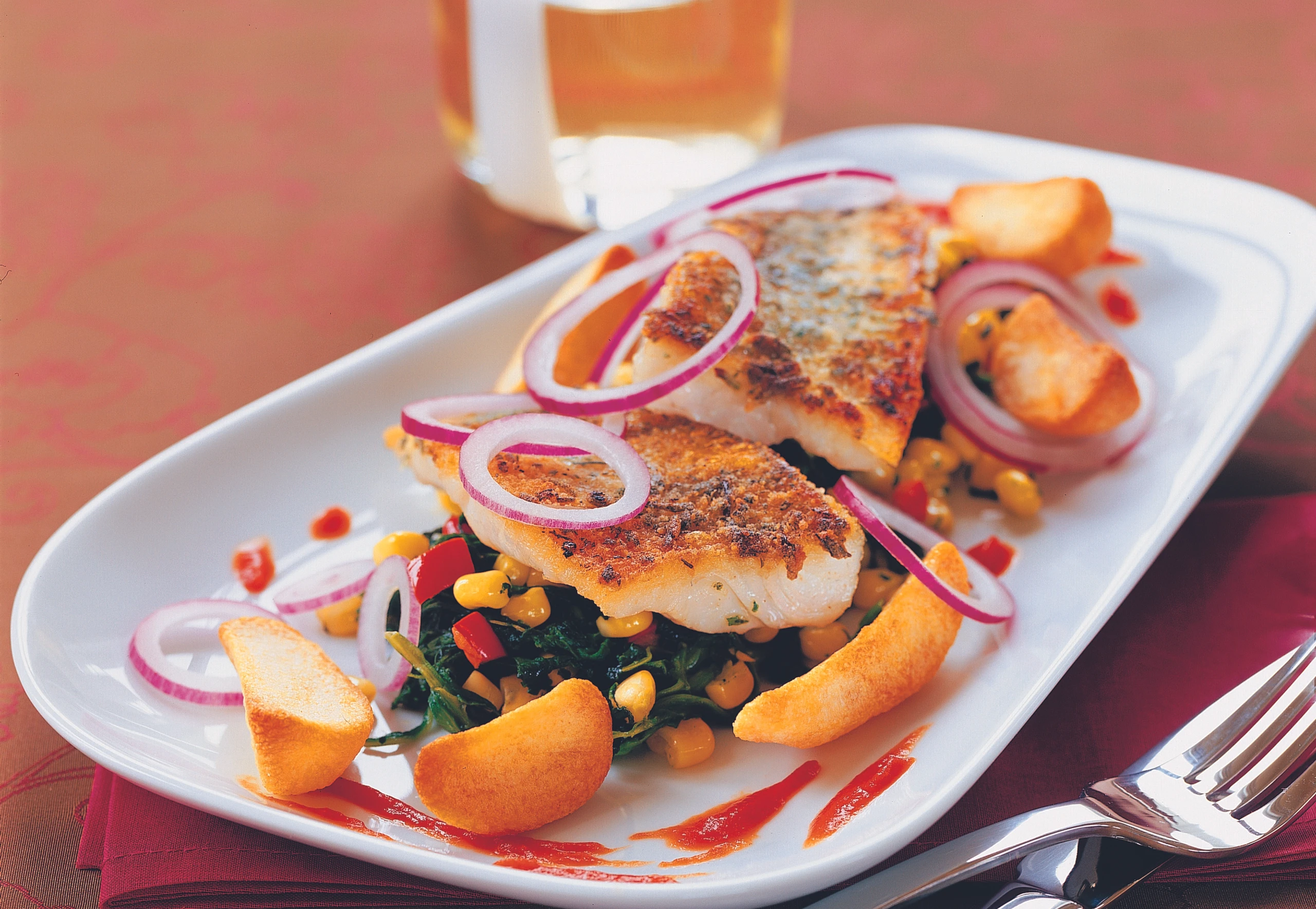 Öl erhitzen, Filets darin beidseitig knusprig braten. Fischfilets mit den Beilagen anrichten.