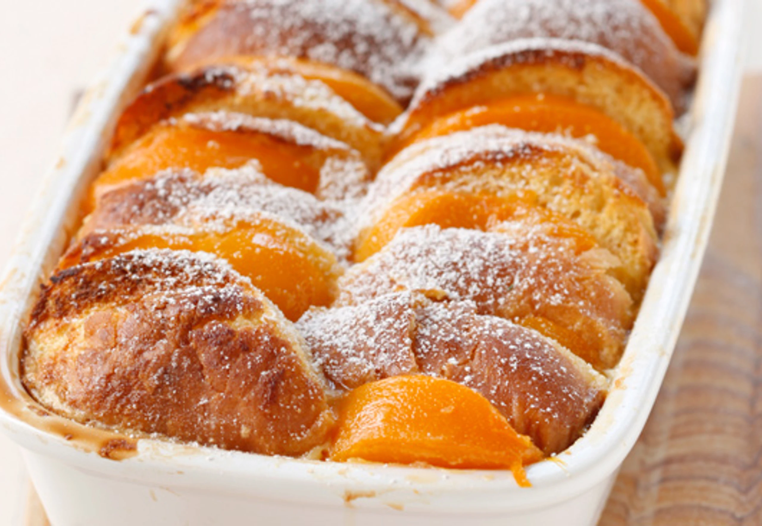 Pfirsiche abtropfen lassen und halbieren. Jeden Krapfen in 3 Scheiben schneiden. Jeweils 2 Krapfenscheiben und eine Pfirsichscheibe dachziegelartig in die Form schichten.