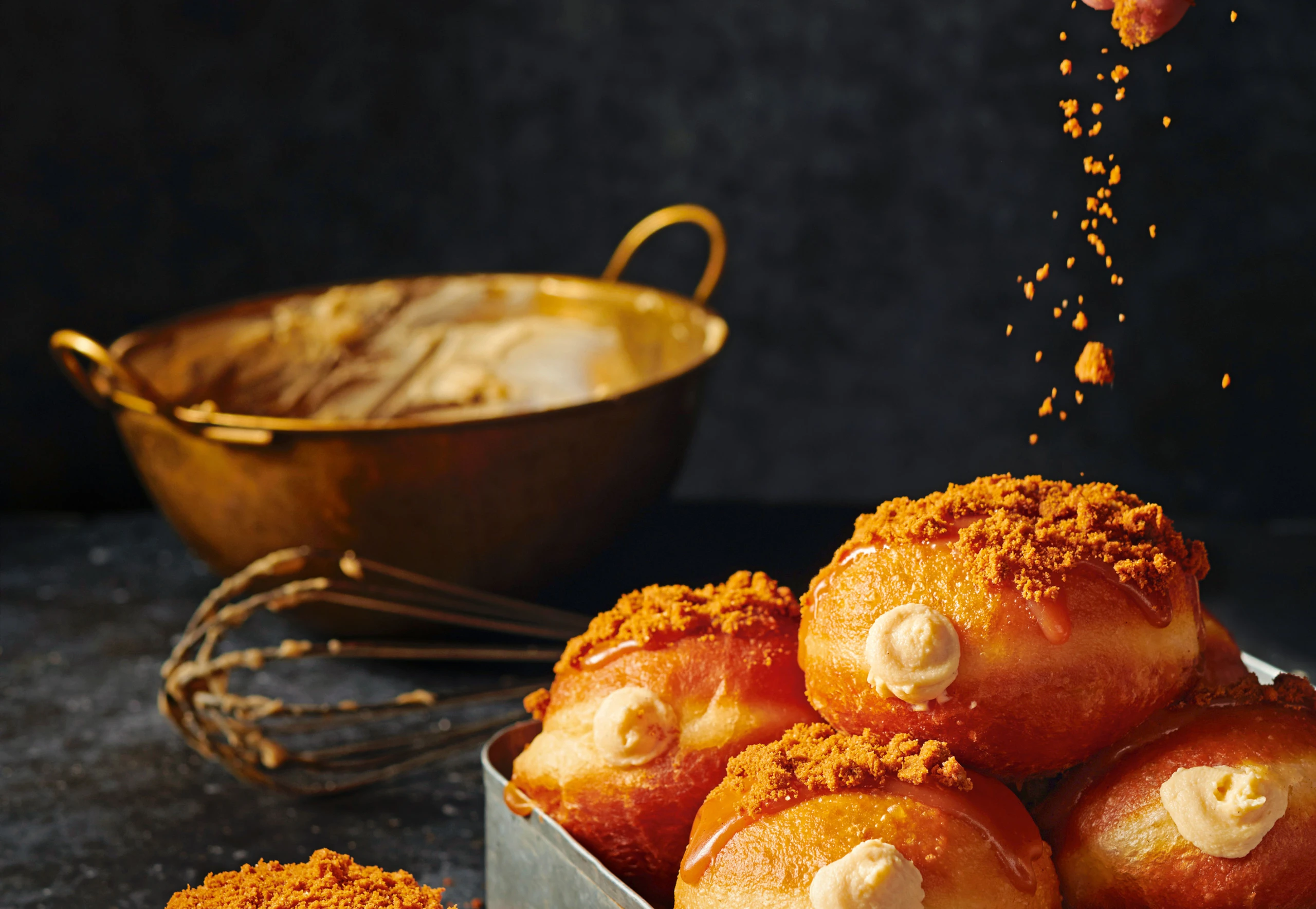 Die Krapfen mit der Creme füllen. Mit Karamell beträufeln und mit Keksbröseln bestreuen.