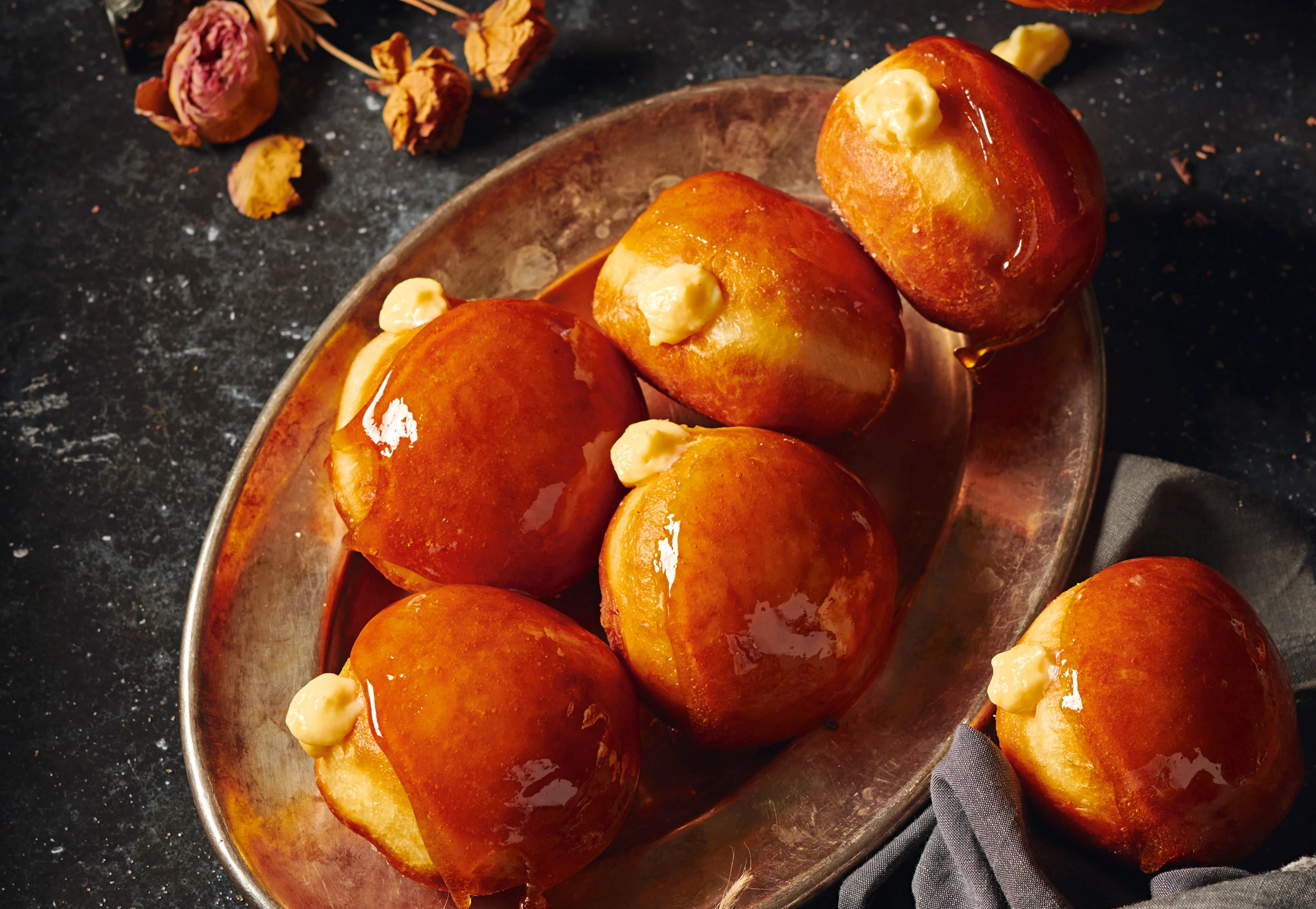 Für die Karamellschicht Zucker und Wasser karamellisieren. Krapfen vorsichtig eintunken, abtropfen und auf Backpapier trocknen lassen.