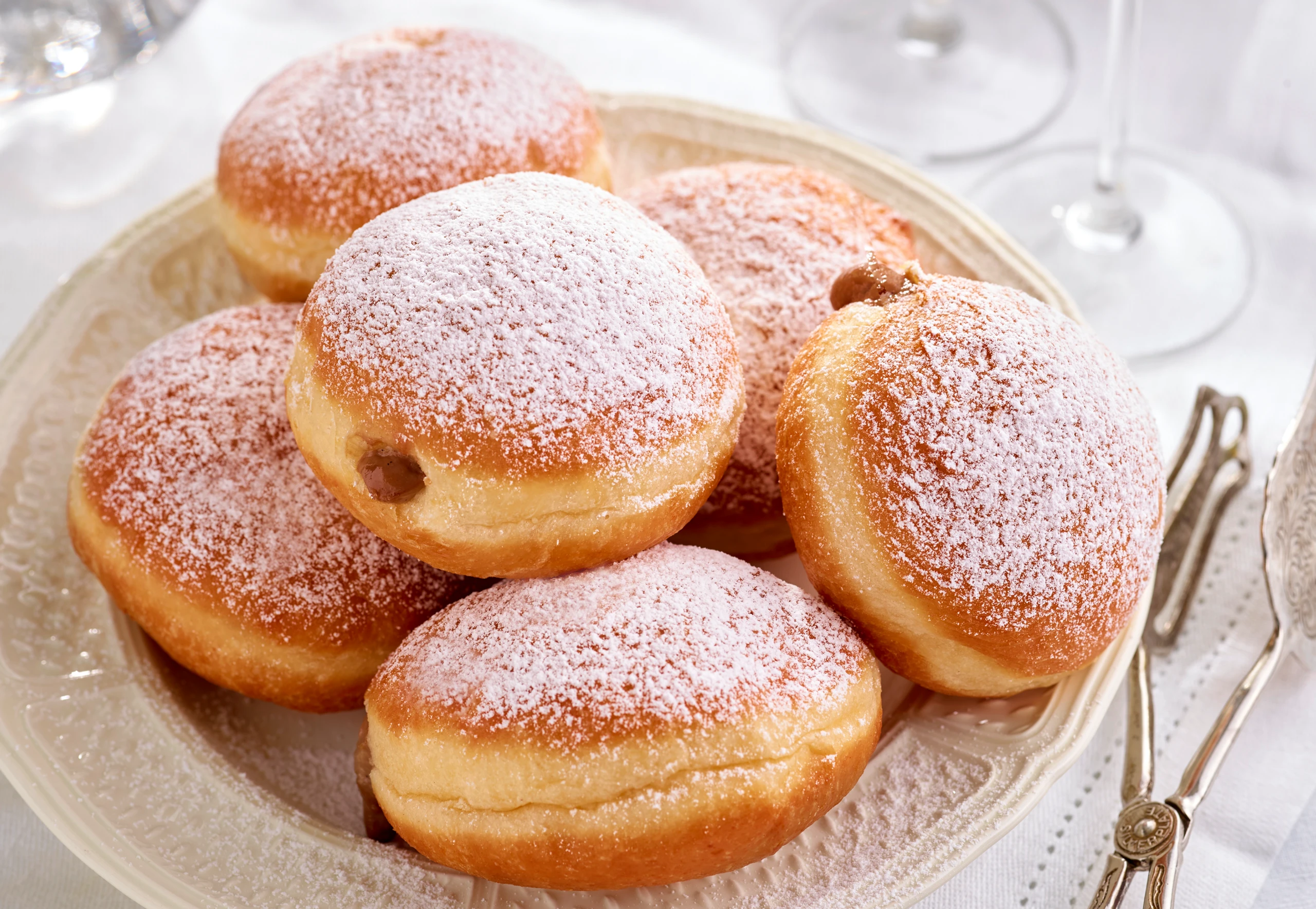 Öl in einem großen Topf auf 180°C erhitzen. Krapfen mit der Oberfläche nach unten hineingeben. Topf abdecken und die Krapfen ca. 3 Minuten braun backen. Wenden und ca. 3 Minuten fertig backen. Krapfen herausnehmen und auf Küchenpapier abtropfen lassen.