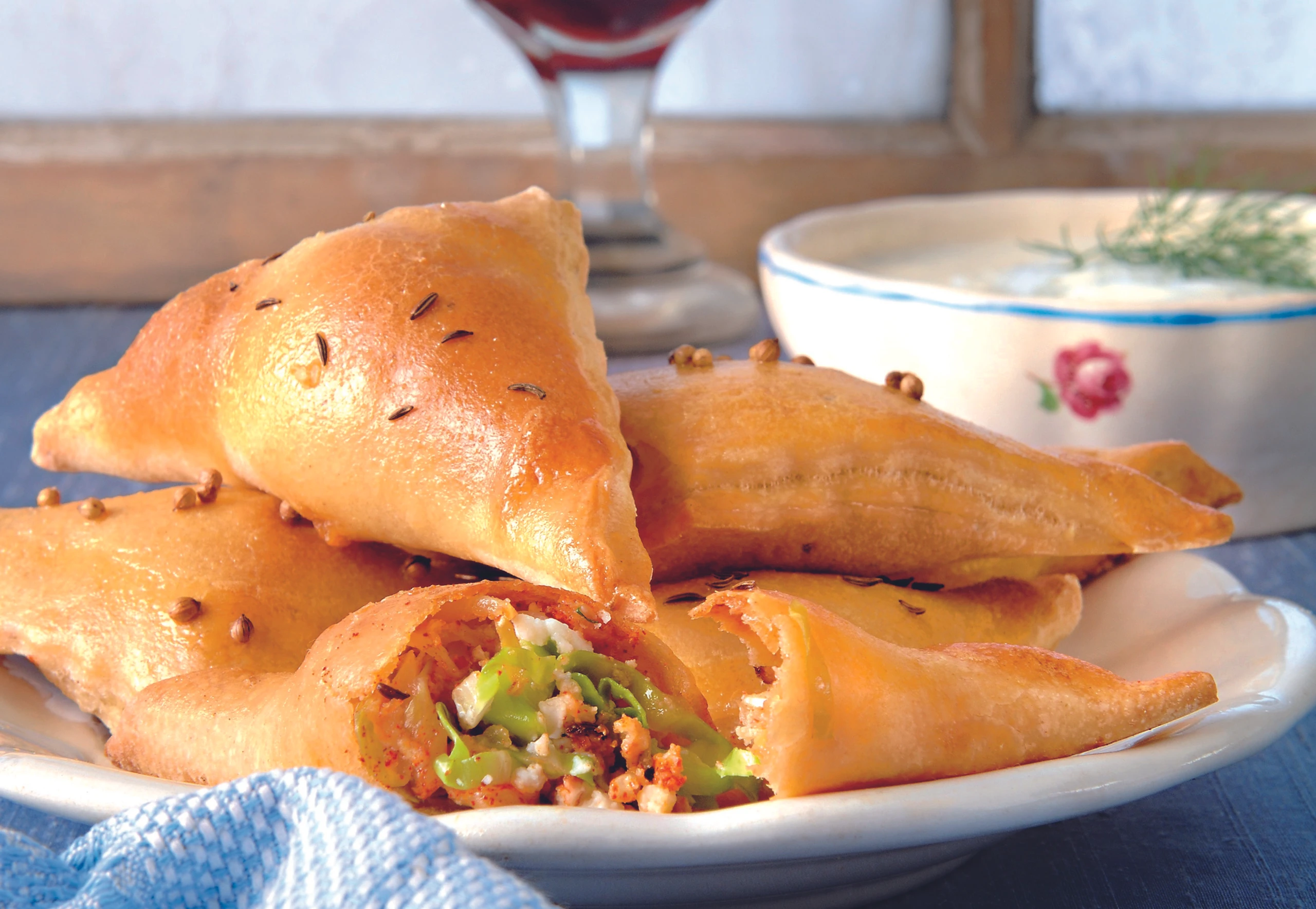 - Rohr auf 200°C vorheizen. Backblech mit Öl bestreichen. Ei mit 1 EL Wasser verquirlen. Teig ausrollen und in Quadrate (ca. 9 x 9 cm) schneiden. Auf jedes 2 TL Füllung geben. Ränder mit Ei bestreichen. Teig zu Dreiecken zusammenklappen; Ränder gut zusammendrücken. Piroggen mit Ei bestreichen, mit Koriander und Kümmel bestreuen, auf das Blech legen und im Rohr backen (mittlere Schiene; ca. 18 Minuten). Mit der Sauce servieren.