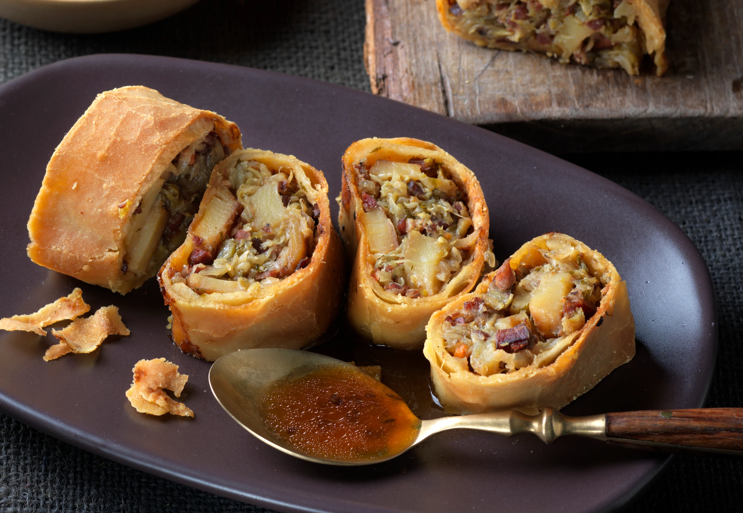 Für die Fülle Erdäpfel kochen, abseihen und auskühlen lassen. Zwiebeln schälen. Zwiebeln und Speck klein schneiden. Kraut halbieren und den Strunk ausschneiden. Kraut in feine Streifen schneiden. Zwiebeln und Speck in 2 EL vom Schmalz anschwitzen. Kraut zugeben und mit Salz, Pfeffer und Kümmel würzen. Suppe zugießen, Kraut bissfest dünsten, umfüllen und auskühlen lassen. Eier einrühren. Erdäpfel schälen, in dünne Scheiben schneiden und im übrigen Schmalz braten. Kraut mit Erdäpfeln und Petersilie vermischen.