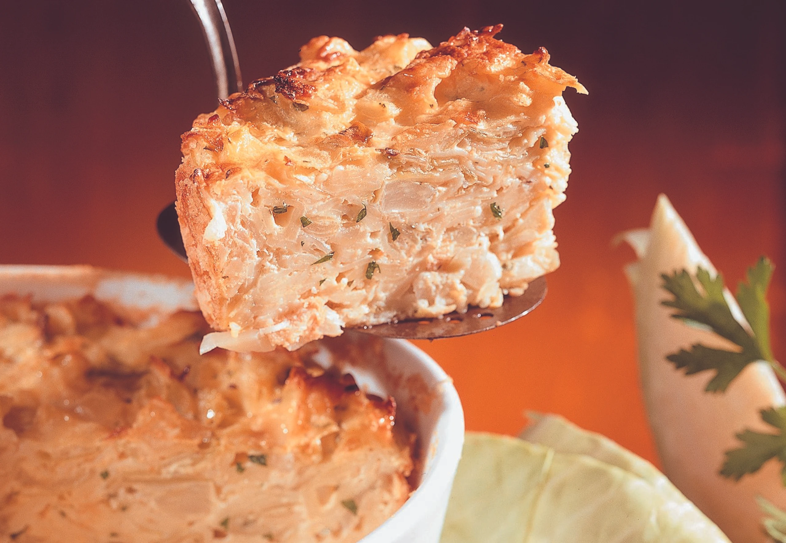 Topfen in ein Tuch einschlagen und behutsam ausdrücken. Topfen mit Eiern und Dottern gut verrühren, Kraut, Fleckerln und Petersil untermischen und die Masse mit Salz, Pfeffer und Kümmel würzen.