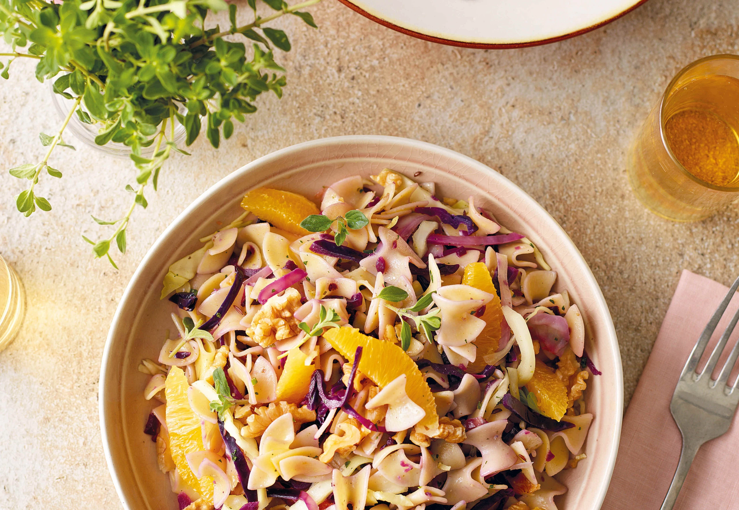 Fleckerl nach Packungsanleitung in reichlich Salzwasser bissfest kochen, abseihen und abtropfen lassen. Fleckerl, Nüsse, Orangenschale, Orangenfilets und Majoran unter das Kraut mischen. Fleckerl mit Salz und Pfeffer würzen.