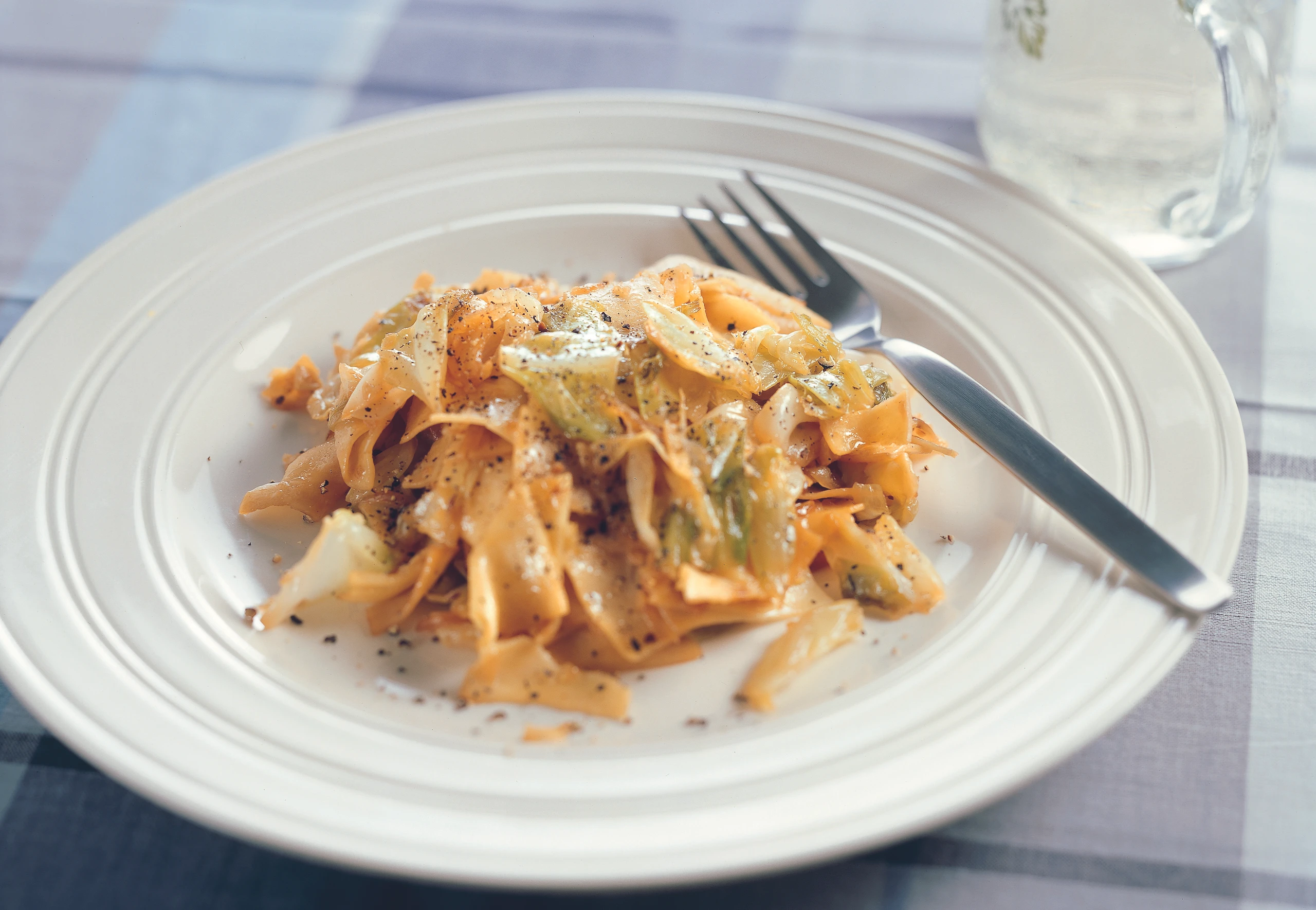 Fleckerl kurz mit heißem Wasser abspülen, abtropfen lassen und mit dem Kraut vermischen. Die Krautfleckerln mit frisch gemahlenem schwarzem Pfeffer würzen.
