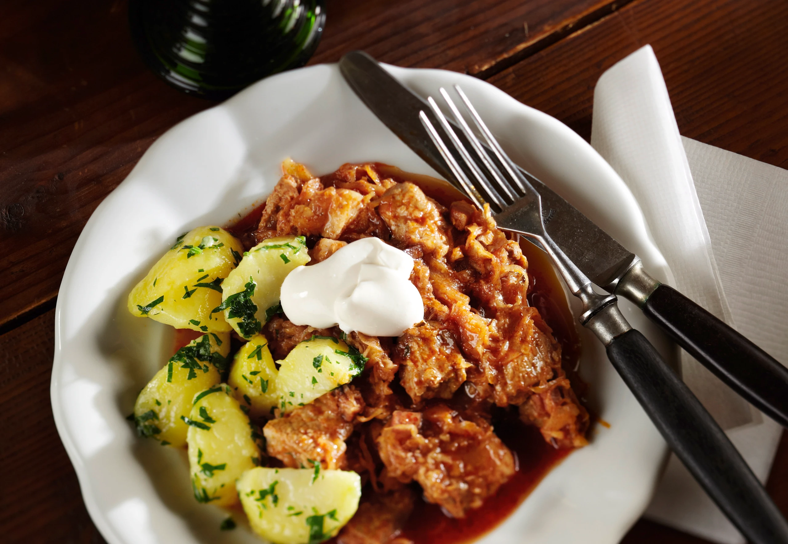 Speck in 1 EL Öl anschwitzen, Zwiebeln zugeben und goldbraun rösten. Paprika einrühren und kurz mitrösten. Mit Wasser aufgießen, aufkochen, mit Salz, Pfeffer, Kümmel und zerdrücktem Knoblauch würzen. Fleisch und 1 Lorbeerblatt zugeben und ca. 90 Minuten dünsten.