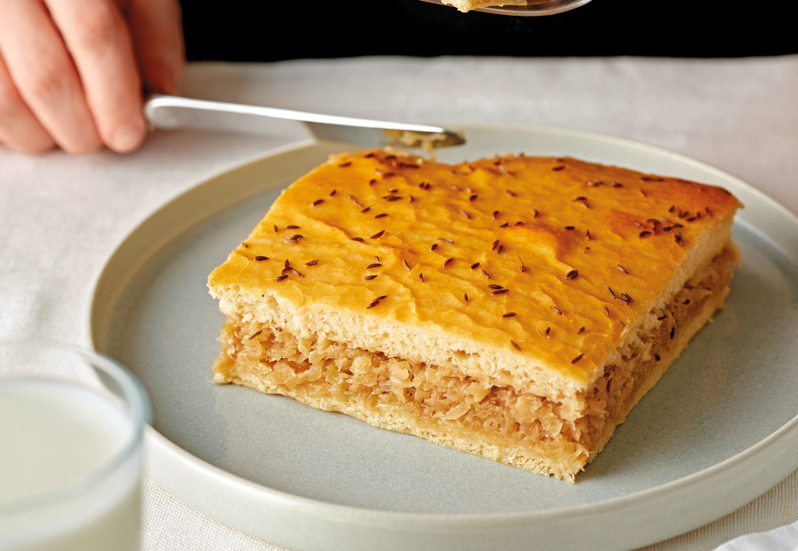 Teig halbieren und jeweils zu 30 x 20 cm großen Rechtecken ausrollen. Eine Teighälfte auf das Blech legen, Krautfülle darauf verteilen. Zweite Teighälfte darauflegen, mit Ei bestreichen und mit Kümmel bestreuen.