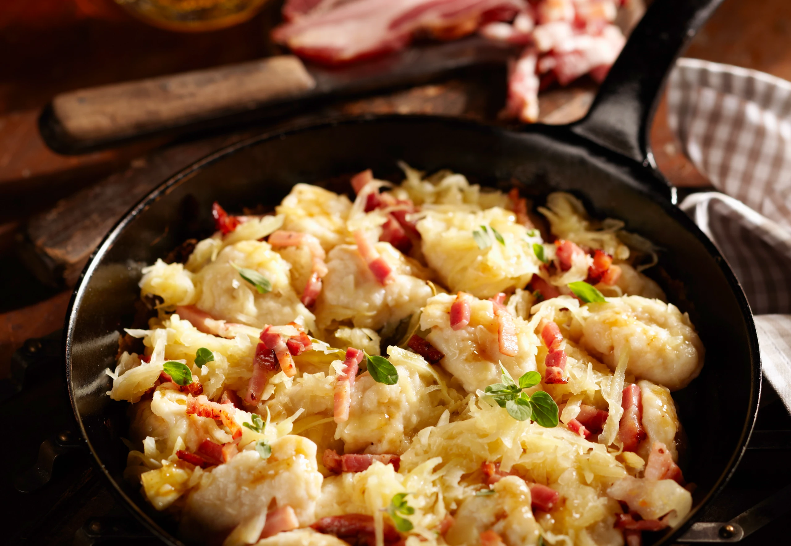 Reichlich Salzwasser aufkochen, aus dem Teig mit einem kleinen Löffel gleich große Nockerl ausstechen, ins Wasser legen und ca. 7 Minuten köcheln. Speck in ca. 0,5 cm große Stücke schneiden und im Öl knusprig braten. Nockerl mit einem Gitterlöffel herausheben, abtropfen lassen und mit Kraut und Speckstücken vermischt anrichten. Nockerl mit Majoran bestreut servieren.