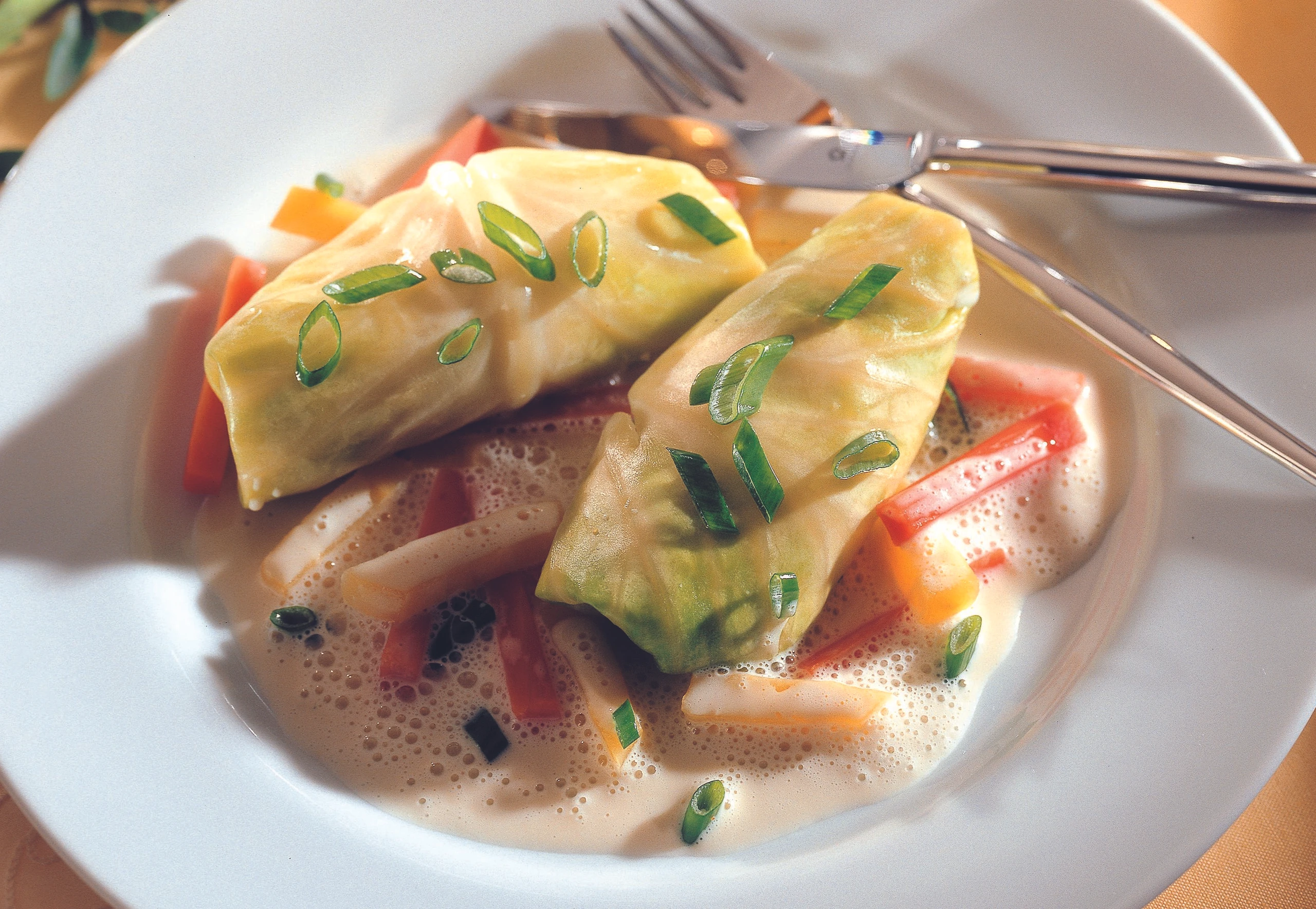 Krautröllchen auf Wurzelgemüse mit Zwiebel-Oberssauce