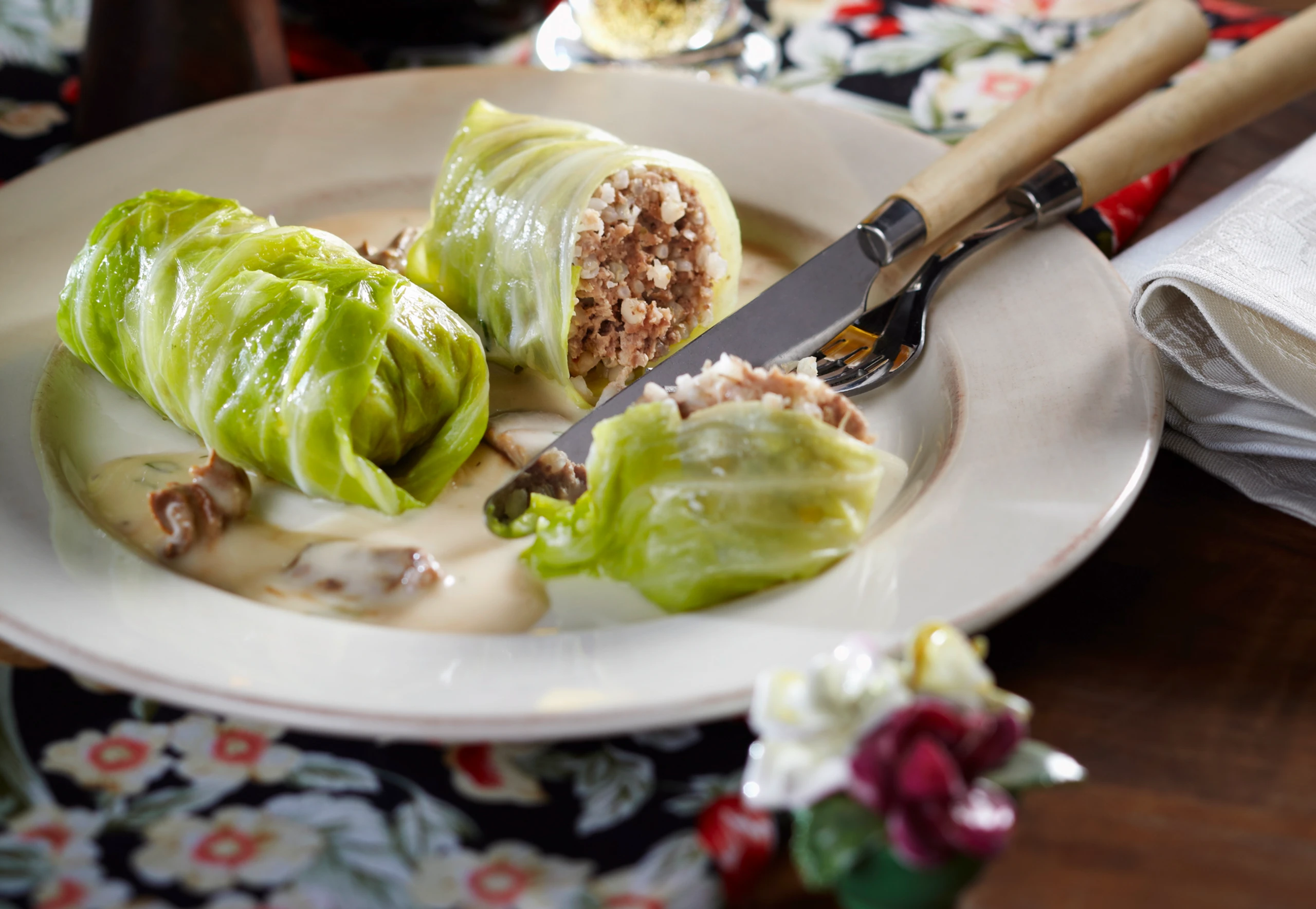 Faschiertes und Getreide vermischen, mit Salz und Pfeffer würzen. 1 Krautblatt pro Roulade (wir rechnen 2 Rouladen pro Portion) auflegen, je 2 EL Fülle darauf verteilen, Blätter seitlich einschlagen und über die Fülle rollen. Rouladen mit Zahnstochern fixieren. Einige Krautblätter in den Topf legen, Rouladen darauf schichten, Pilze zugeben, mit Wasser aufgießen. Topf zudecken, Rouladen ca. 1 Stunde köcheln.