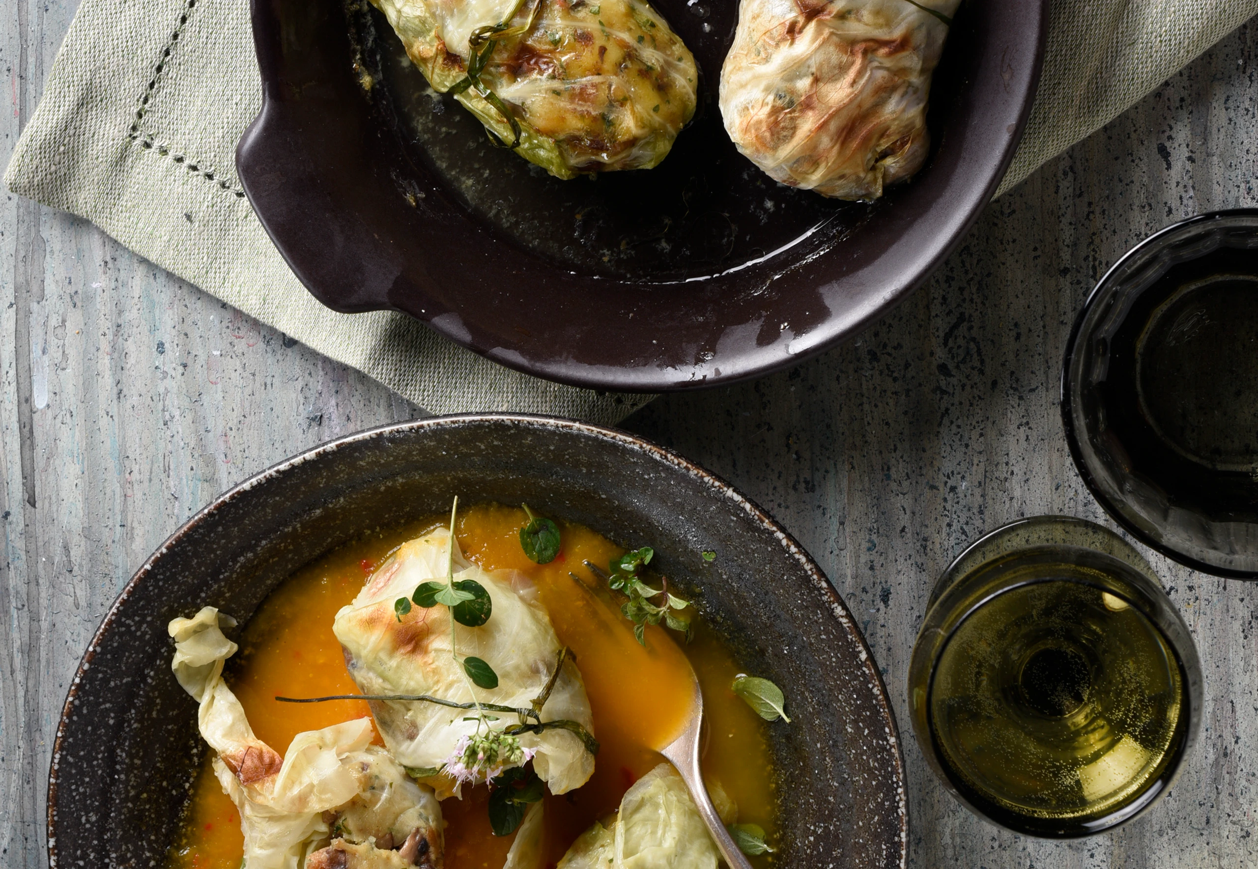Krautrouladen mit Schwammerlfülle und Kürbis-Chilisauce