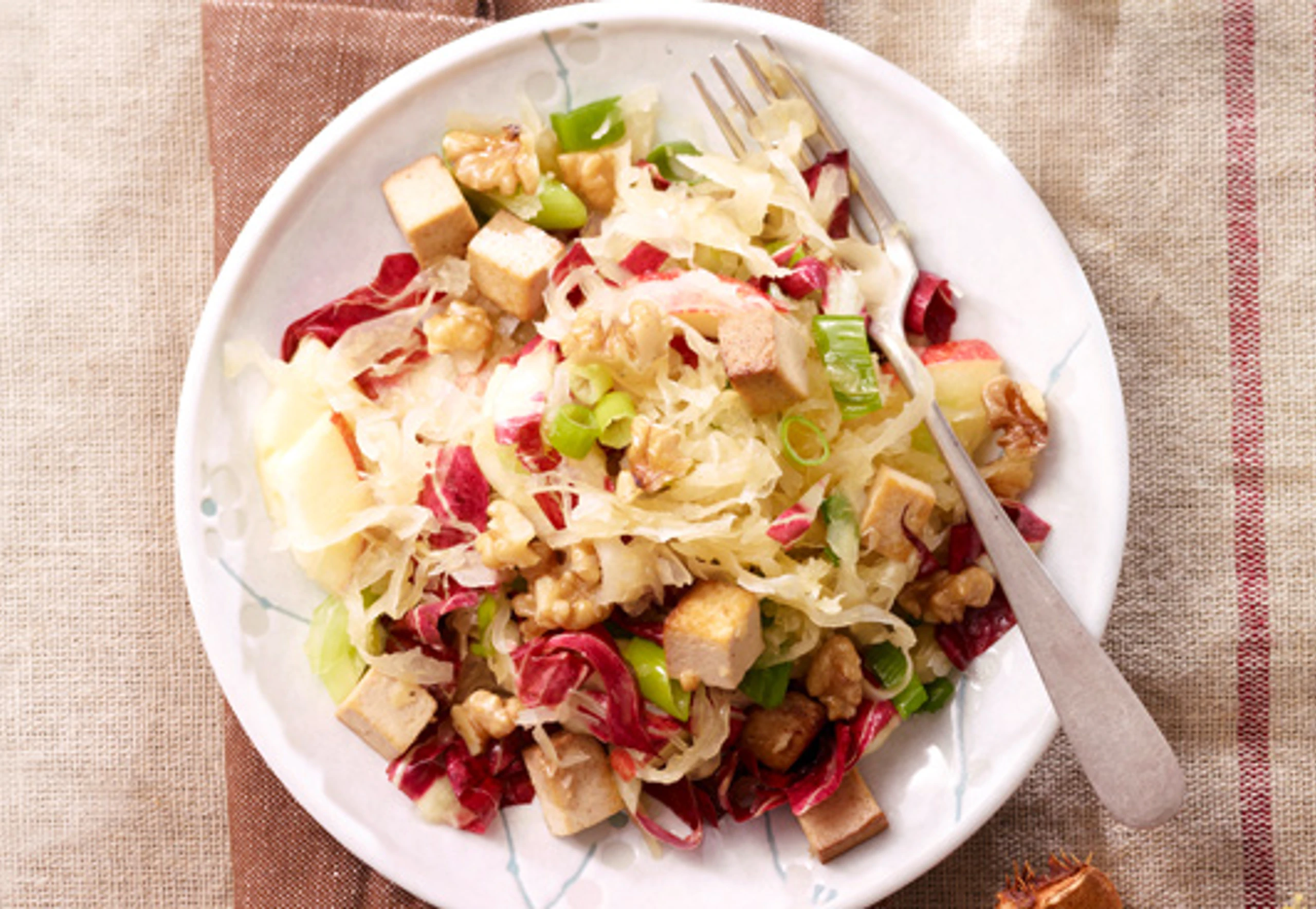 Tofu und Nüsse in 2 EL Öl anbraten und aus der Pfanne nehmen. Kraut, Jungzwiebel, Radicchio und die Tofumischung mit der Marinade vermischen und 5 Minuten ziehen lassen. Salat anrichten.