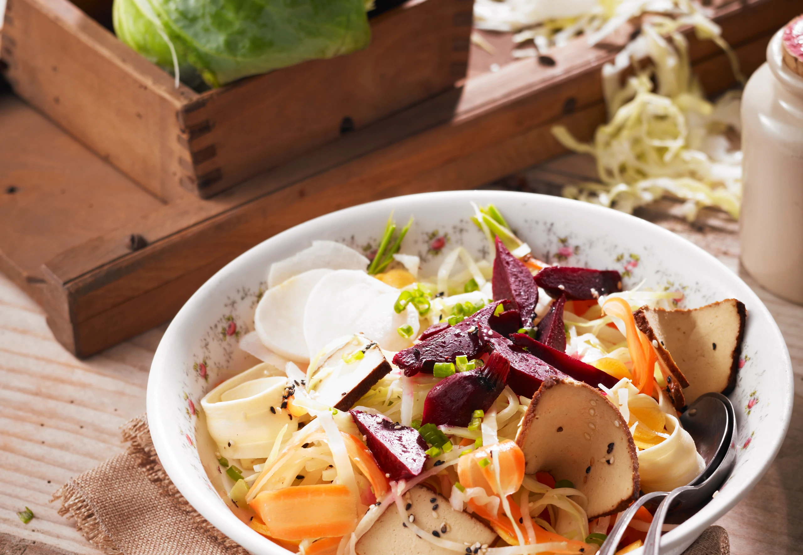 Tofu in Scheiben schneiden und zum Salat geben. Salat eventuell mit Roten Rüben und Rettich servieren.