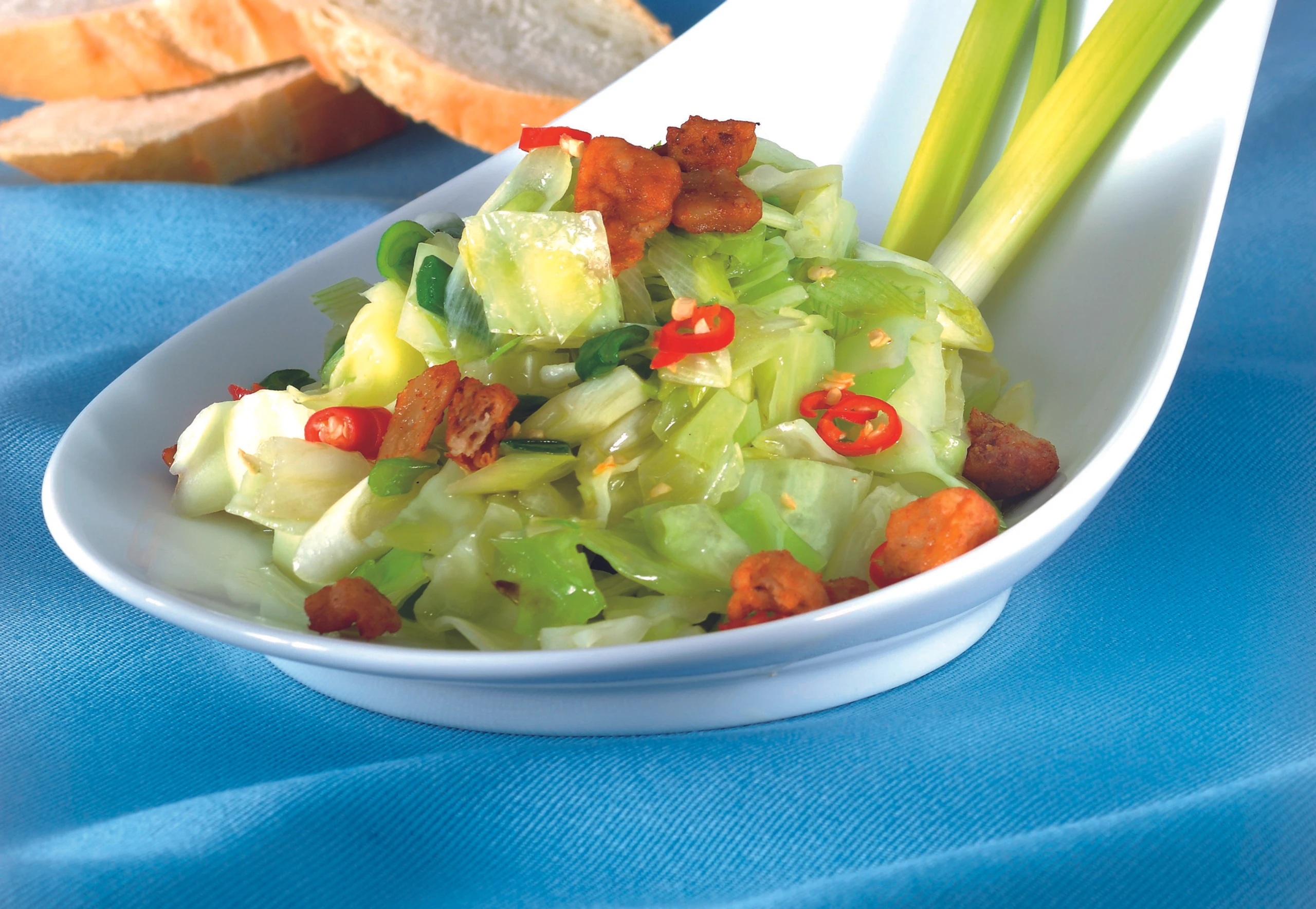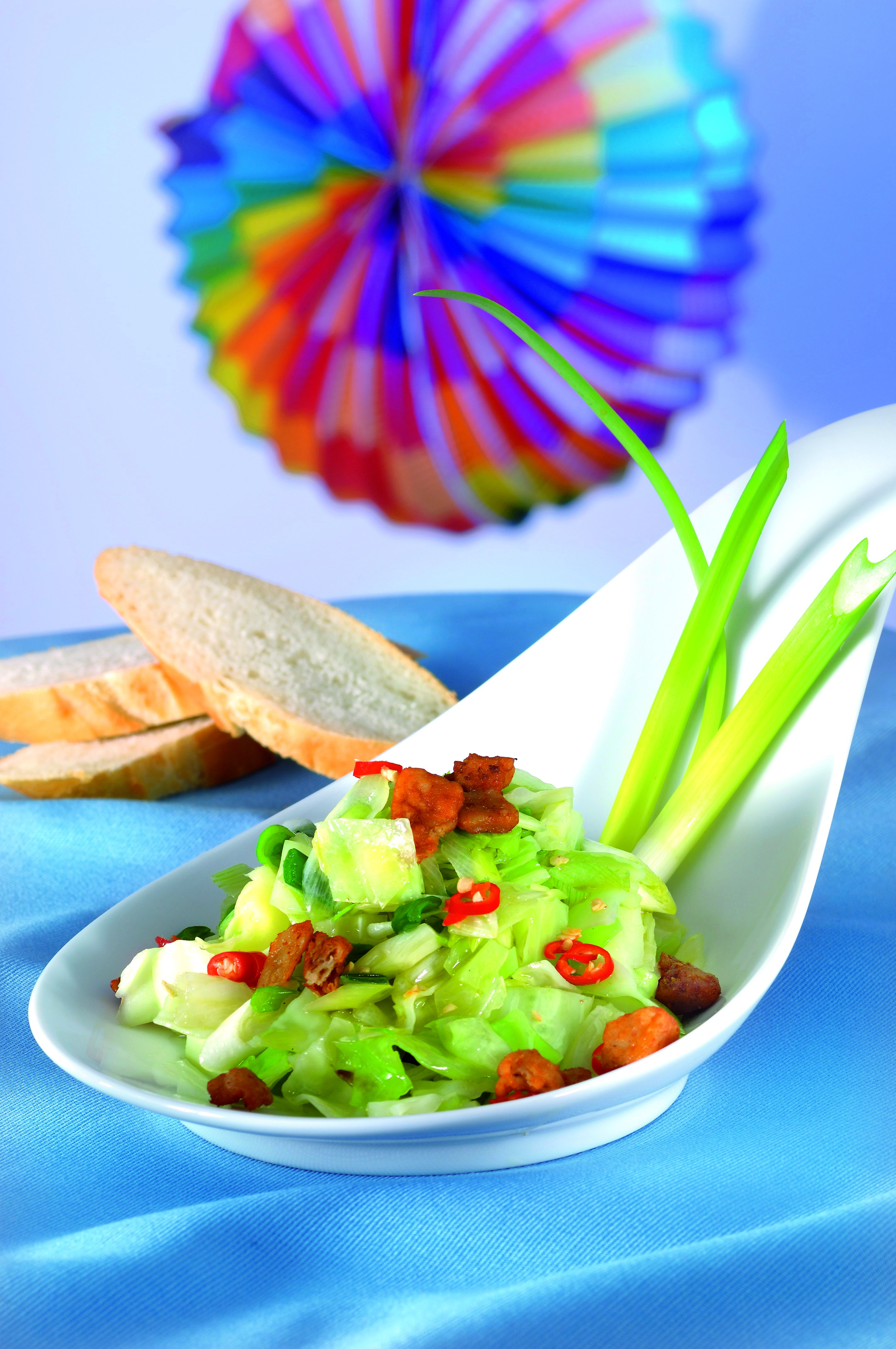 - Kraut mit dem Wasser in einen Topf geben, zudecken, aufkochen und ca. 2 Minuten dämpfen. Jungzwiebeln zugeben und noch 1 Minute dämpfen. Kraut in eine Schüssel leeren. Balsamico, Chilis, Salz und Öl zugeben. Salat durchmischen und mindestens 5 Minuten ziehen lassen.
