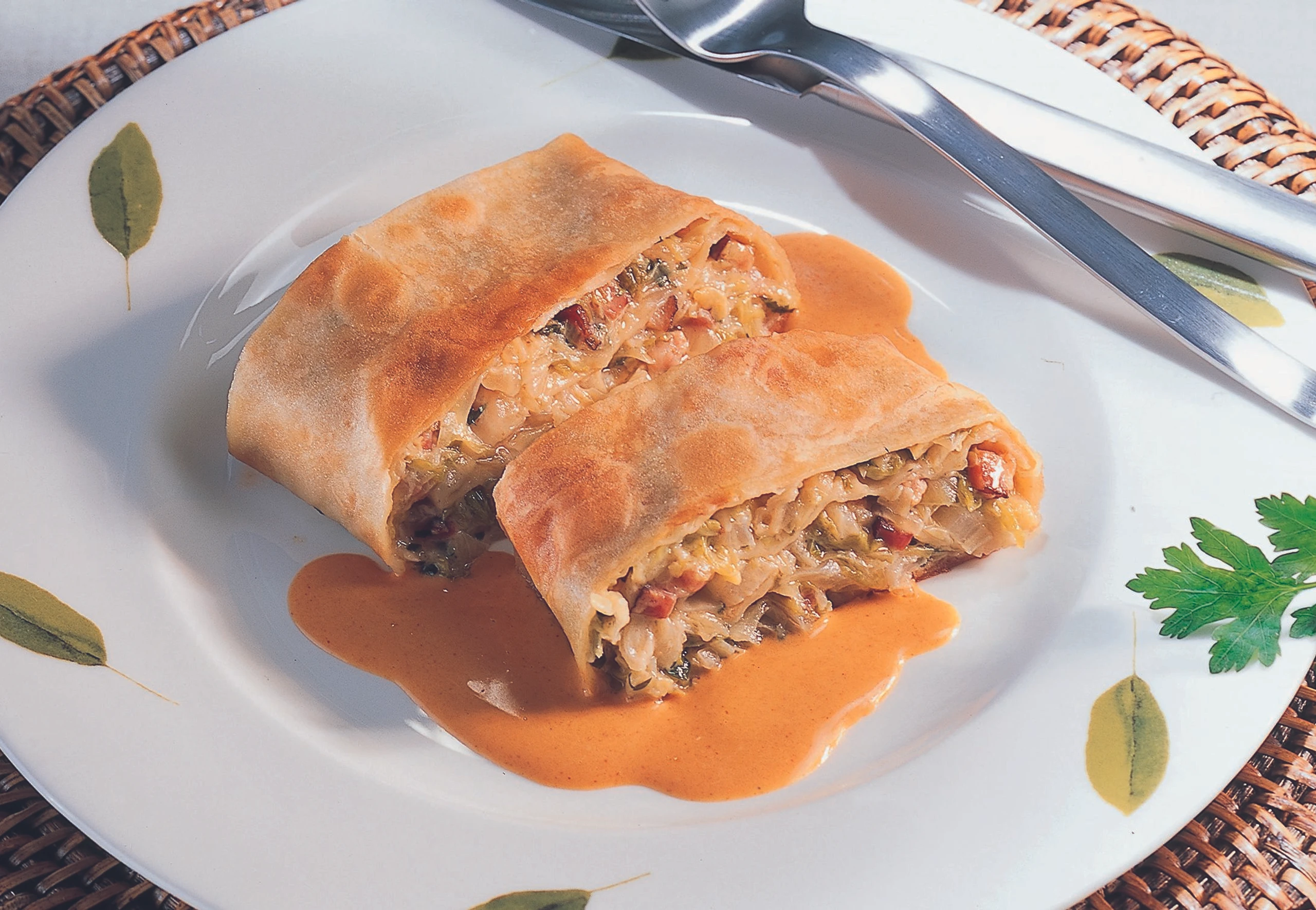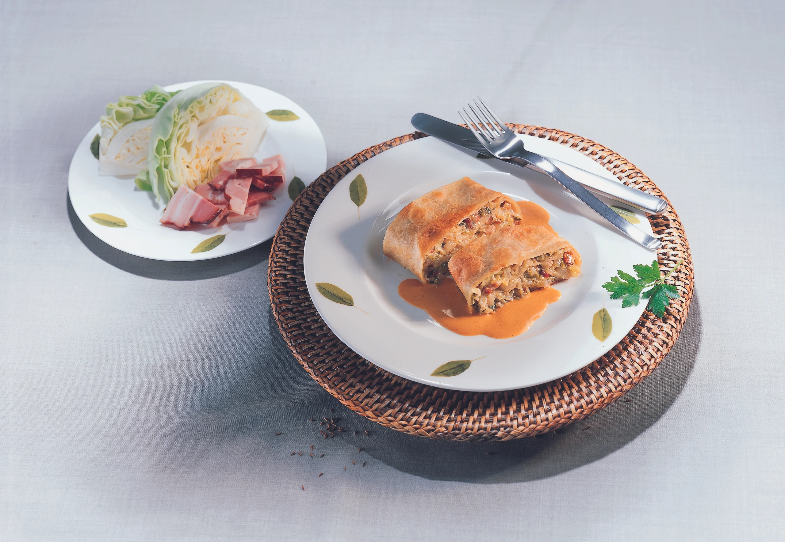 Krautmasse am unteren Teigrand auftragen, seitliche Ränder einschlagen und den Teig von unten über die Fülle einrollen. Strudel auf das Backblech legen, mit Butter bestreichen und ca. 30 Minuten im Rohr (mittlere Schiene) goldgelb backen.