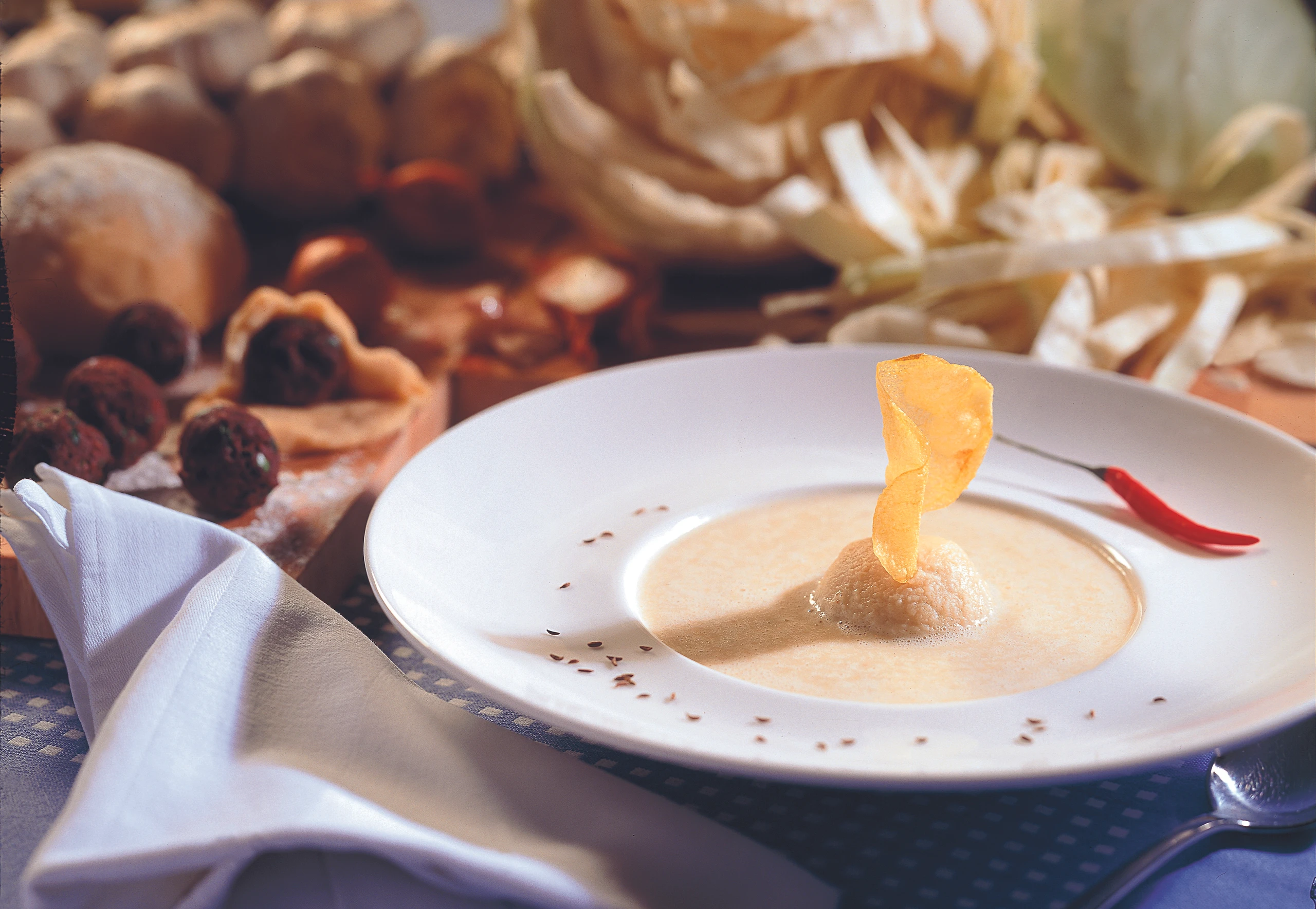 Kraut und wenig Kümmel dazugeben, mit Mostessig ablöschen. Essig verdampfen lassen, mit Rindsuppe aufgießen und das Kraut ca. 30 Minuten weich köcheln.