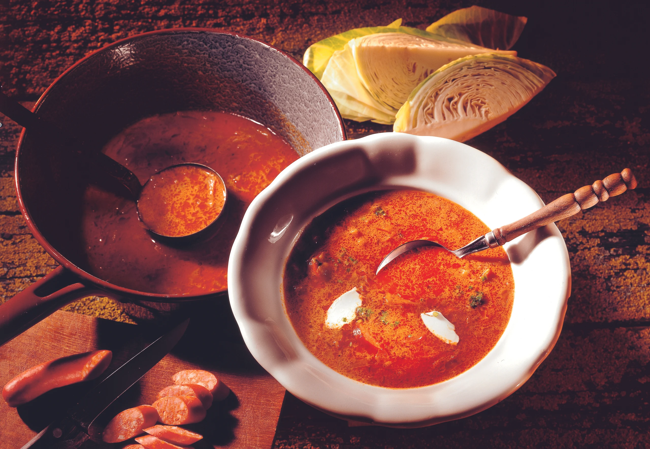 Zwiebel schälen und längs halbieren. In dünne Scheiben schneiden und in Schmalz anrösten. Kraut zugeben und kurz mitdünsten. Paprika einrühren. Kraut mit Suppe aufgießen und auf kleiner Flamme ca. 1 Stunde köcheln.
