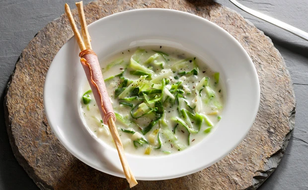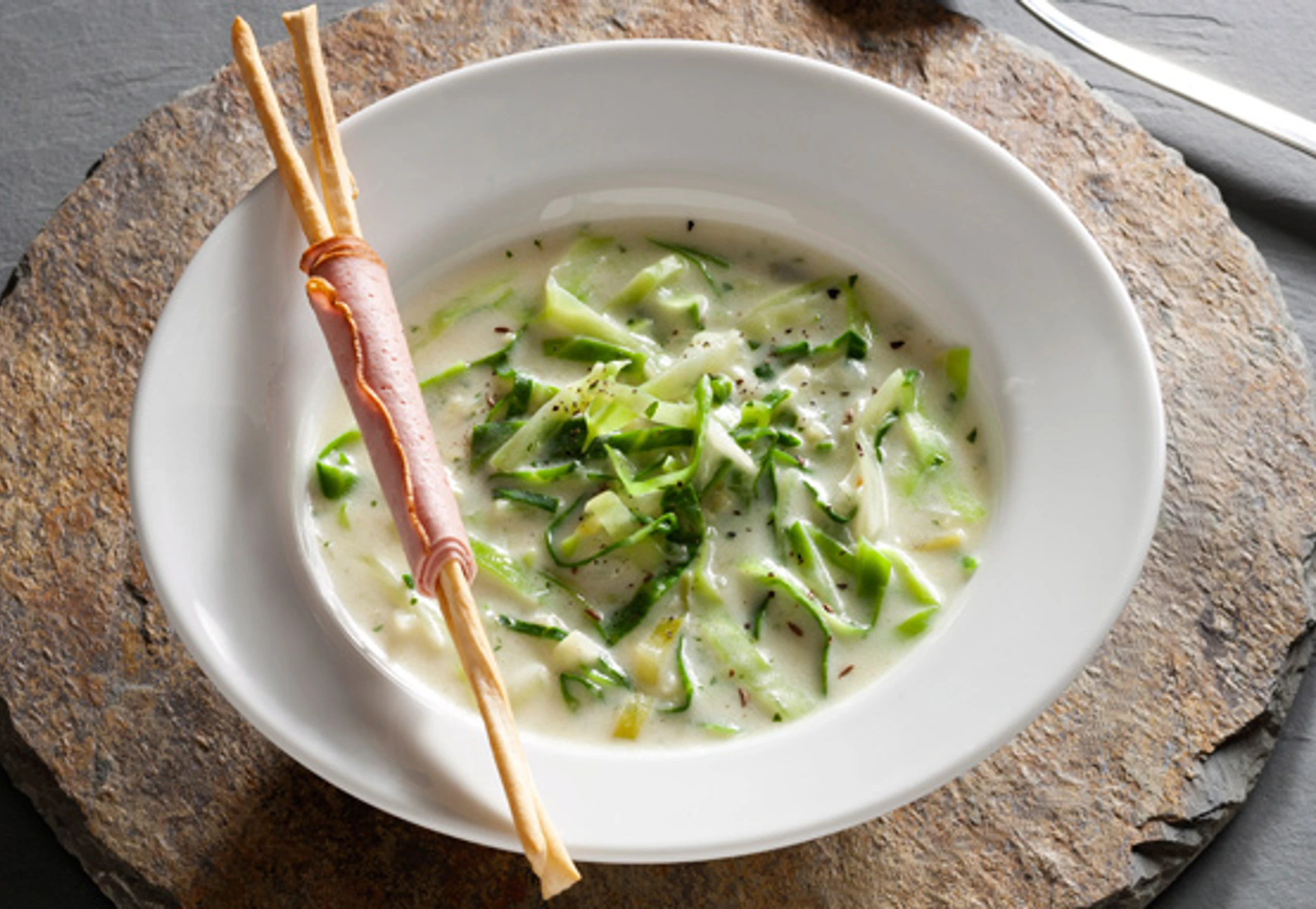 - Krautsuppe anrichten, mit Petersilie, Pfeffer und wenig Kümmel bestreuen und mit den Leberkäse-Grissini garniert servieren.