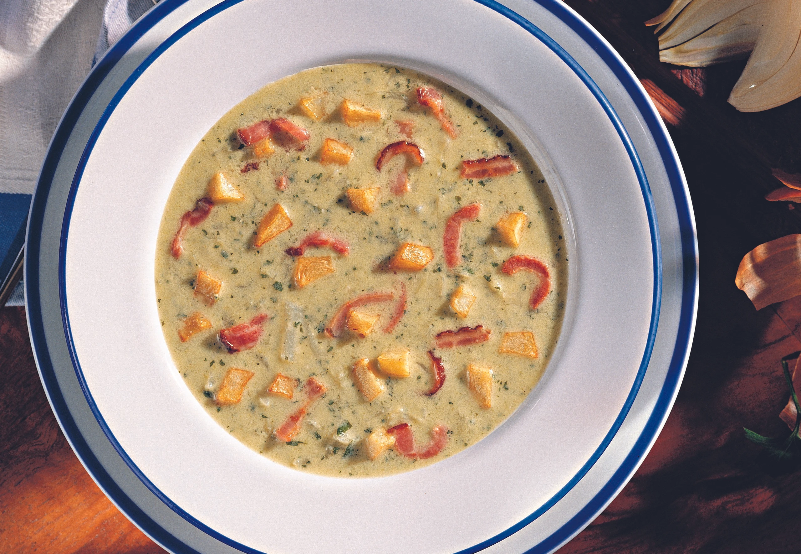 Speck in Streifen schneiden und ohne Fett in einer Pfanne knusprig braten. Suppe in Teller schöpfen und mit gebratenem Speck und Erdäpfelwürfeln bestreut servieren.