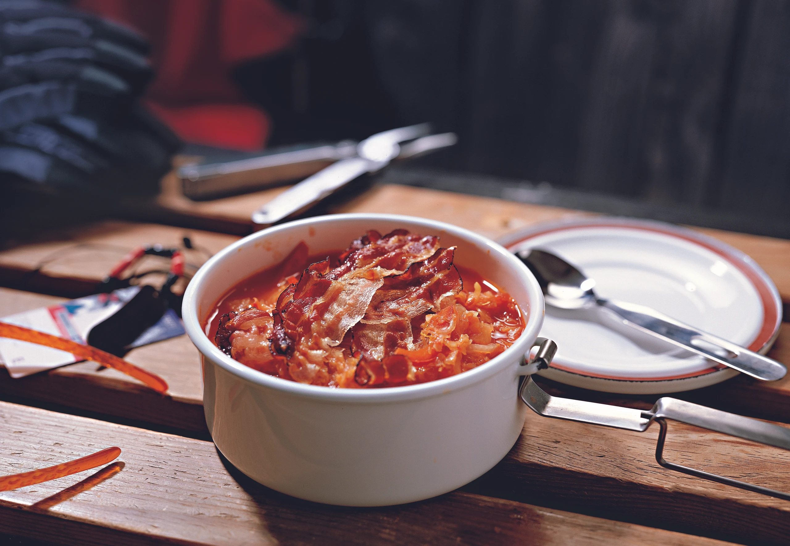 Mit Suppe und Tomaten aufgießen, ausgedrücktes Sauerkraut zugeben.