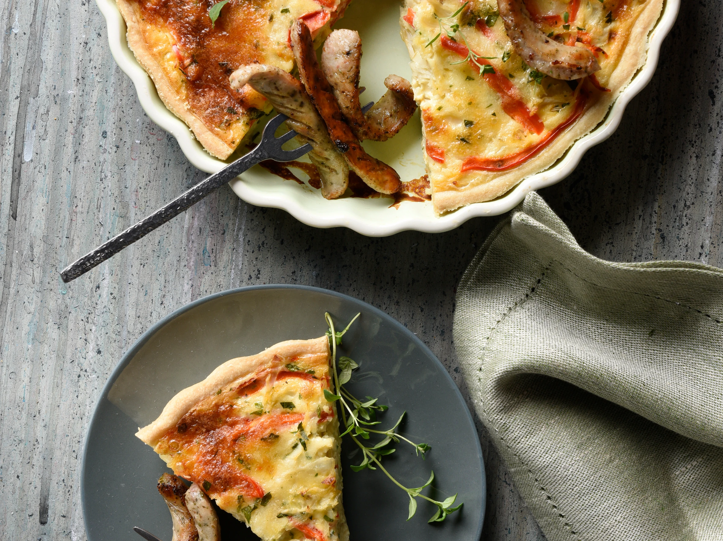 In einer Pfanne Öl erhitzen und die Würstel darin beidseitig braten. Tarte mit den Würsteln anrichten und eventuell mit Thymian garniert servieren.