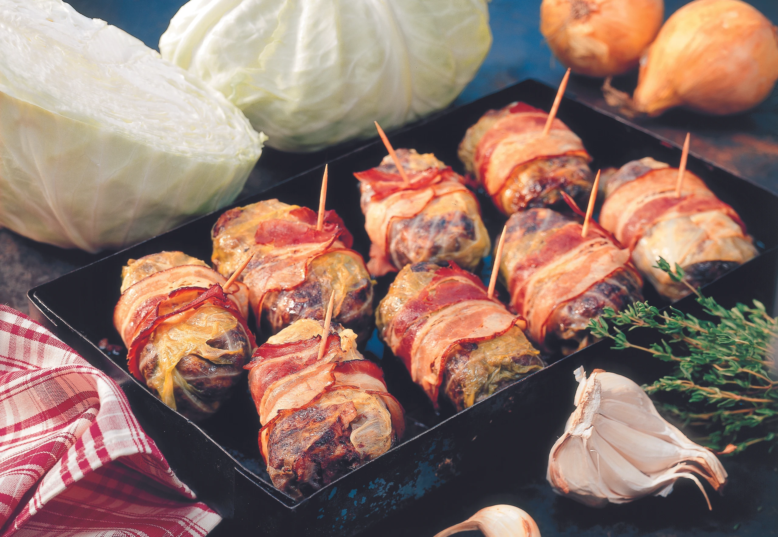 Backrohr auf 200 °C vorheizen. Fülle in 8 gleich schwere Portionen teilen und zu daumendicken Röllchen formen. Krautblätter am unteren Rand mit den Wurströllchen belegen, Seitenränder einschlagen und die Krautblätter über die Fülle einrollen. 5Krautwickler mit je einer Speckscheibe umwickeln, mit Zahnstochern fixieren und mit Öl bestreichen. Krautwickler in eine Pfanne setzen, mit 125 ml von der Suppe untergießen und im vorgeheizten Rohr (mittlere Schiene / Gitterrost) ca. 40 Minuten garen, dabei nach und nach mit der übrigen Suppe übergießen.