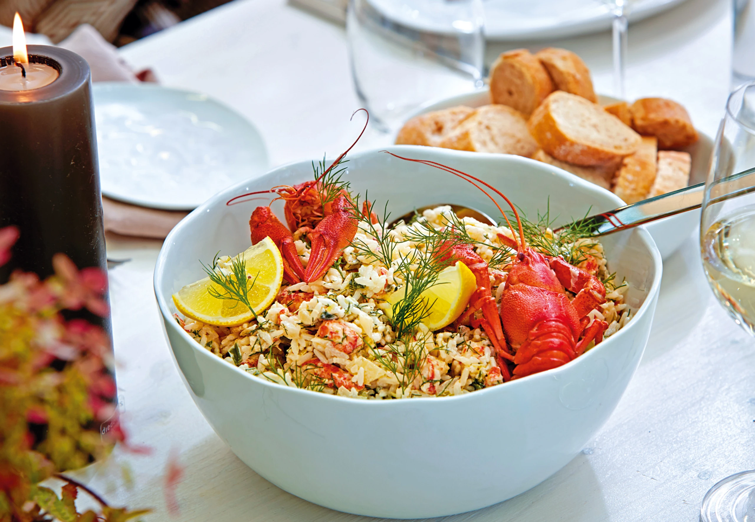 Krebsschwänze in einem Sieb gut abtropfen lassen und mit Salz und Zitronensaft vermischen. Schalotten schälen. Lauch putzen und waschen. Fenchel längs halbieren und den Strunk ausschneiden. Gemüse klein würfeln und in Butter anschwitzen. Mit Wein ablöschen und das Gemüse bissfest dünsten. Reis in Salzwasser bissfest kochen, abseihen, abschrecken und gut abtropfen lassen. Dillzweige abzupfen und hacken.