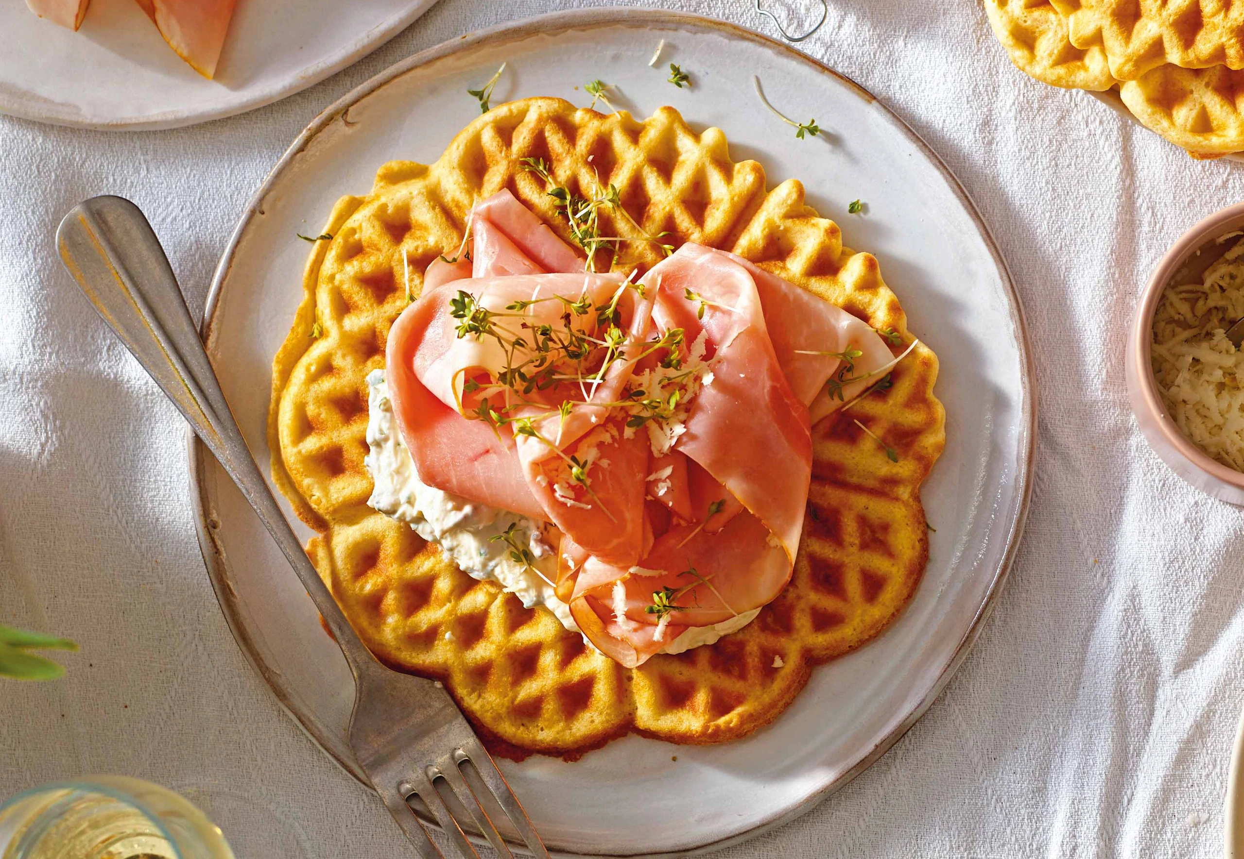 Kresse abschneiden. Waffeln mit Aufstrich, Schinken, Kren und Kresse anrichten.