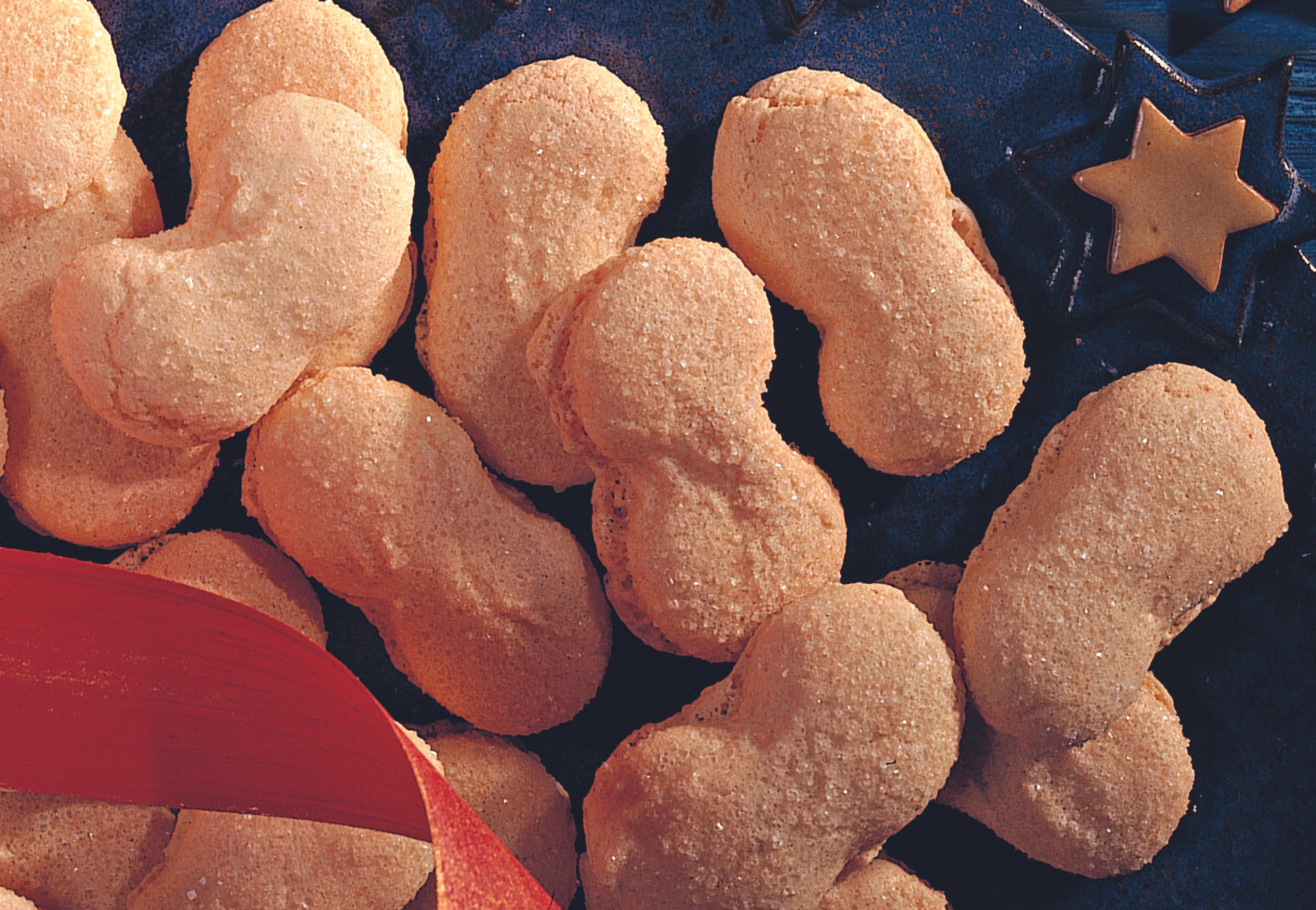 Masse mit einem Teelöffel zu kleinen Häufchen portionieren, behutsam in Kristallzucker wälzen und auf die Backbleche setzen. Stangerl jeweils in der Mitte ein wenig zusammendrücken.