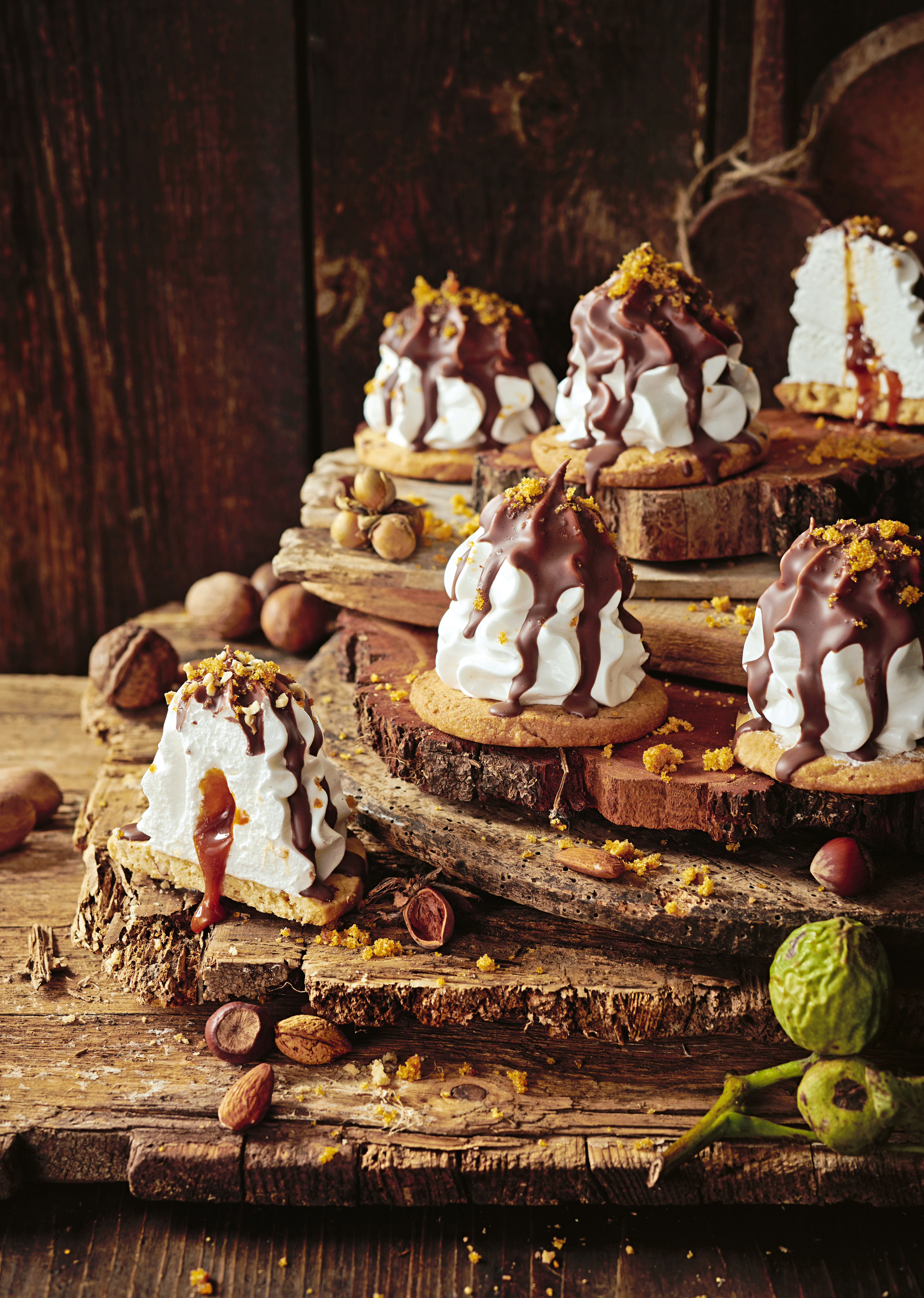 Für die Schaummasse Eiklar und Zucker über einem Wasserbad vorsichtig erwärmen, bis der Zucker aufgelöst ist. Vom Herd nehmen und ca. 10 Minute mixen, bis ein fester, glänzender Schnee entsteht. Vanille untermixen. In einen Dressiersack mit Sterntülle füllen und auf die Kekse dressieren. Karamell in einen Dressiersack mit kleiner Lochtülle füllen. Karamell vorsichtig in die Mitte der Schaummasse spritzen.