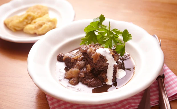 Kronfleisch in Rotwein-Zwiebelsauce