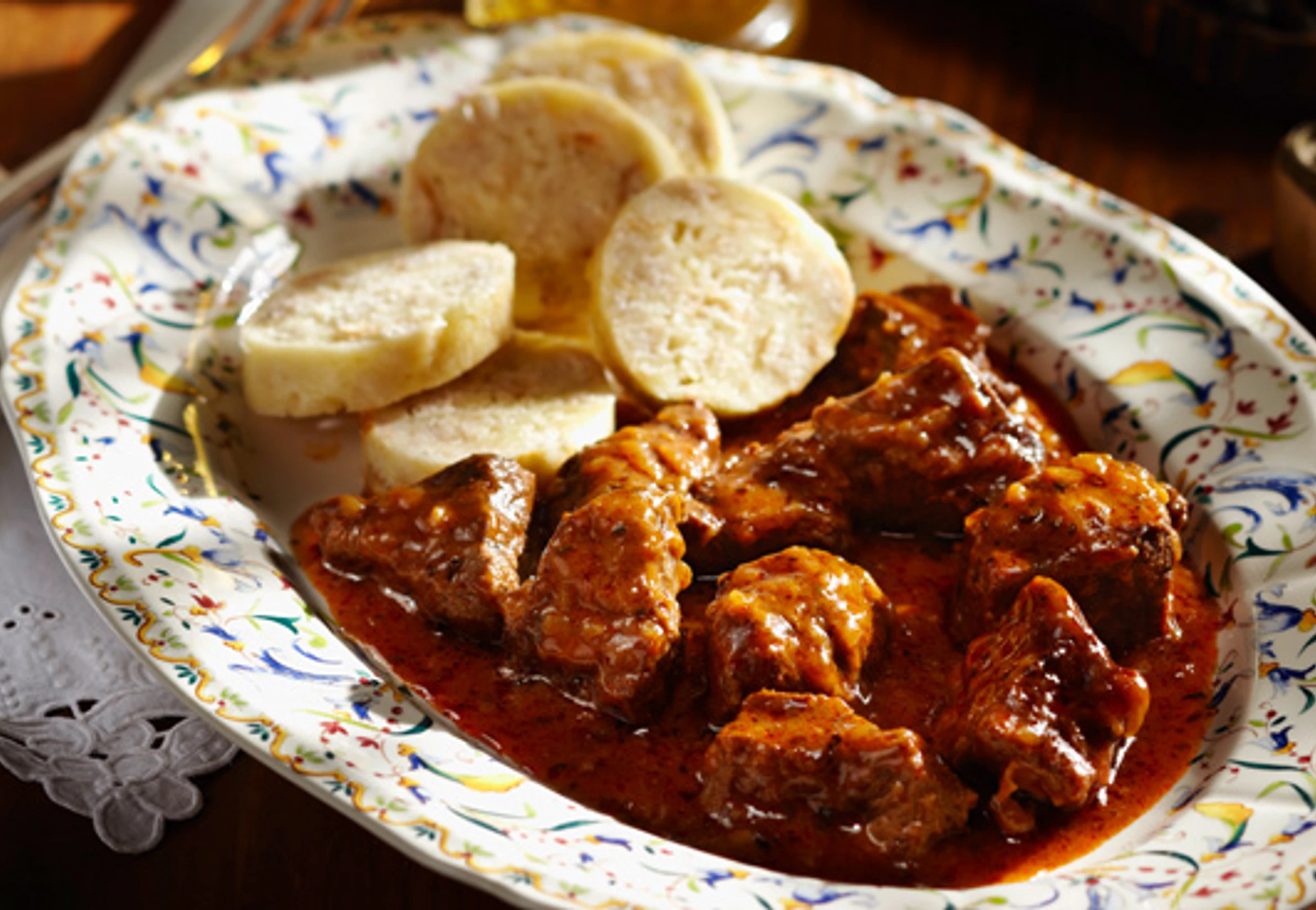 Gulasch mit Majoran, zerdrücktem Knoblauch und Chilipulver abschmecken und mit den Knödeln servieren.