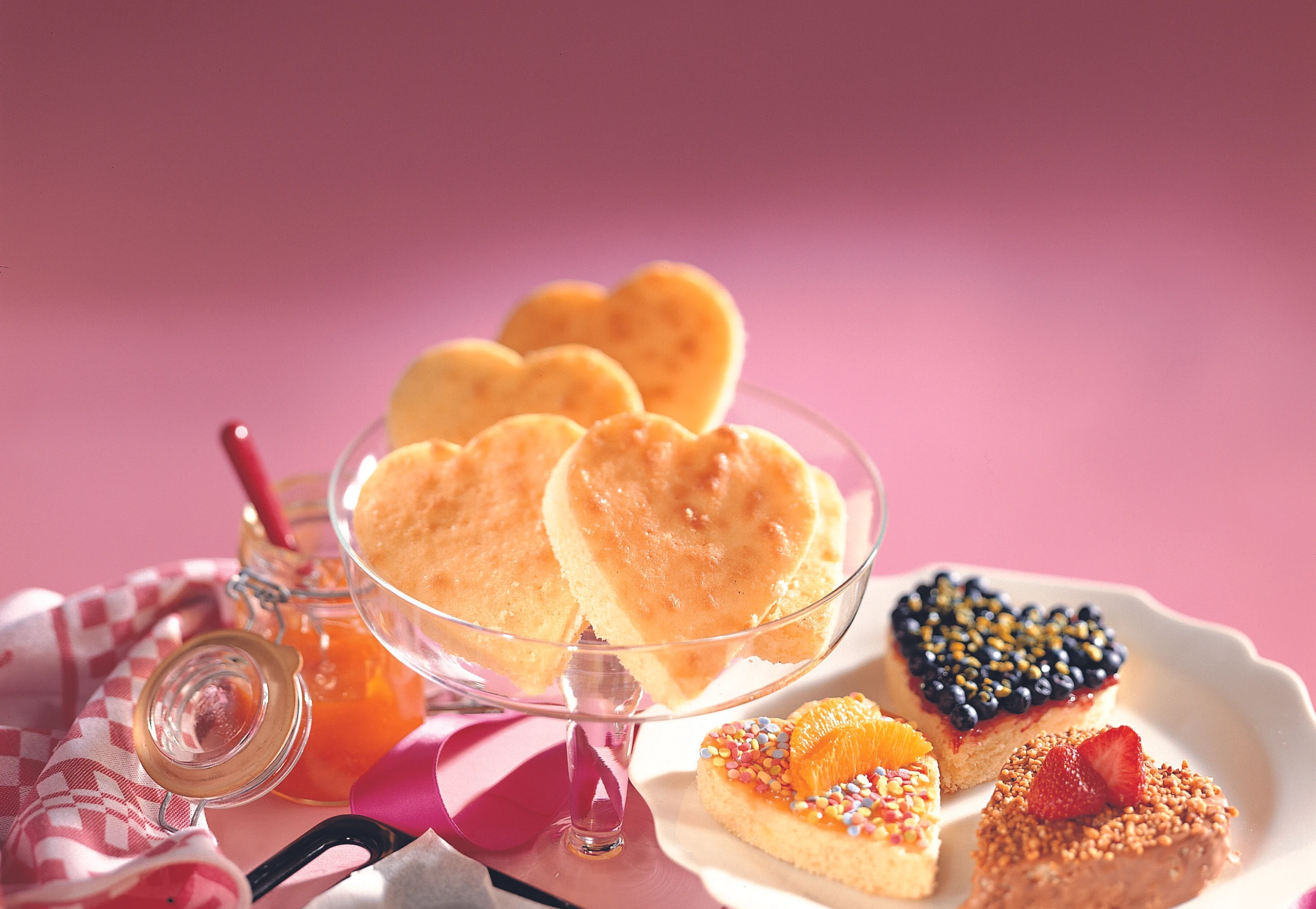 Aus dem Kuchen Herzen (9 cm lang, 8 cm breit) ausstechen, mit Marmelade oder Schokolade bestreichen und nach Belieben belegen.