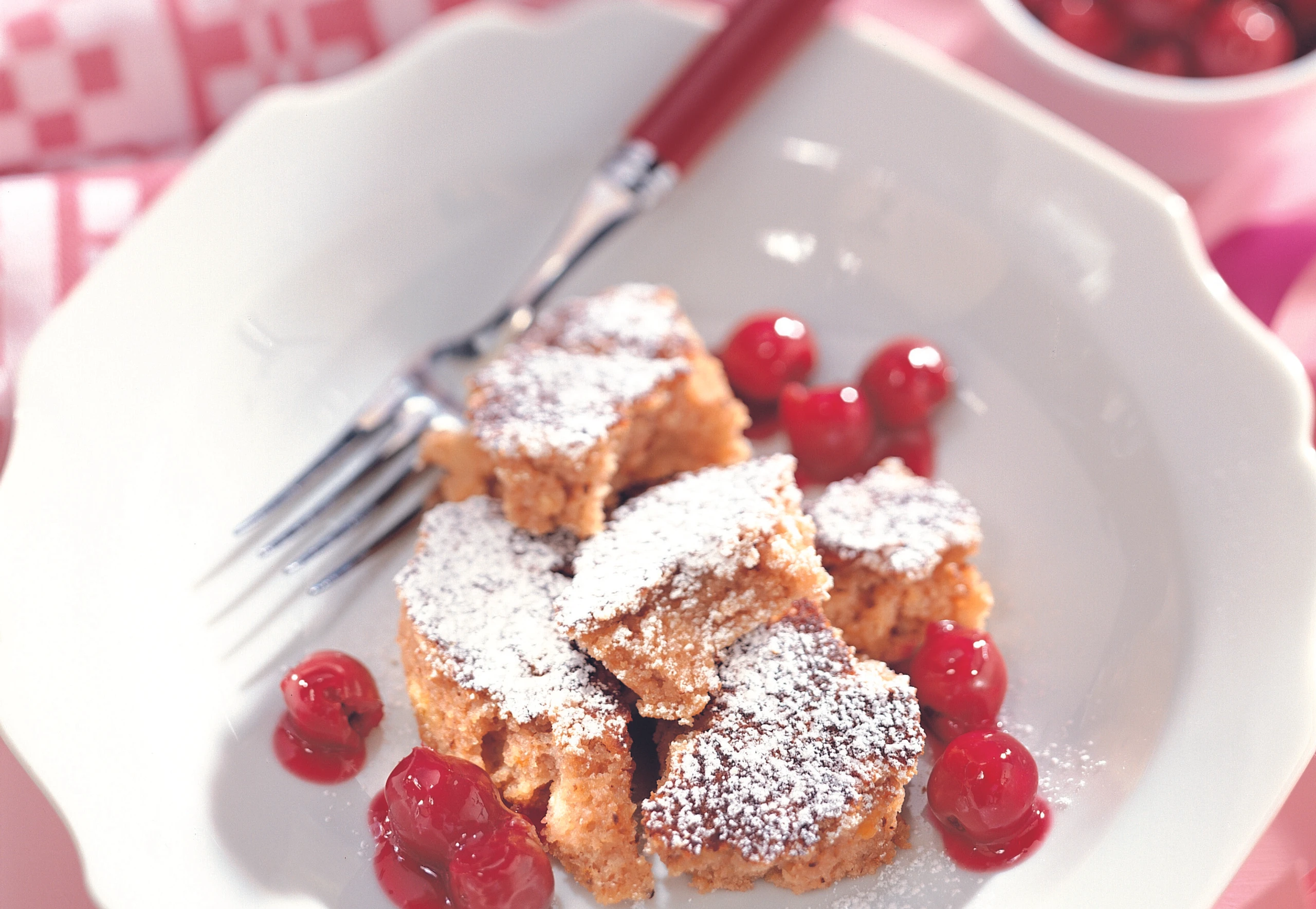 Schmarren aus dem Rohr nehmen, kurz rasten lassen und mit 2 Löffeln in Stücke reißen. Schmarren mit Staubzucker bestreut servieren. Dazu passt Kirschenkompott.