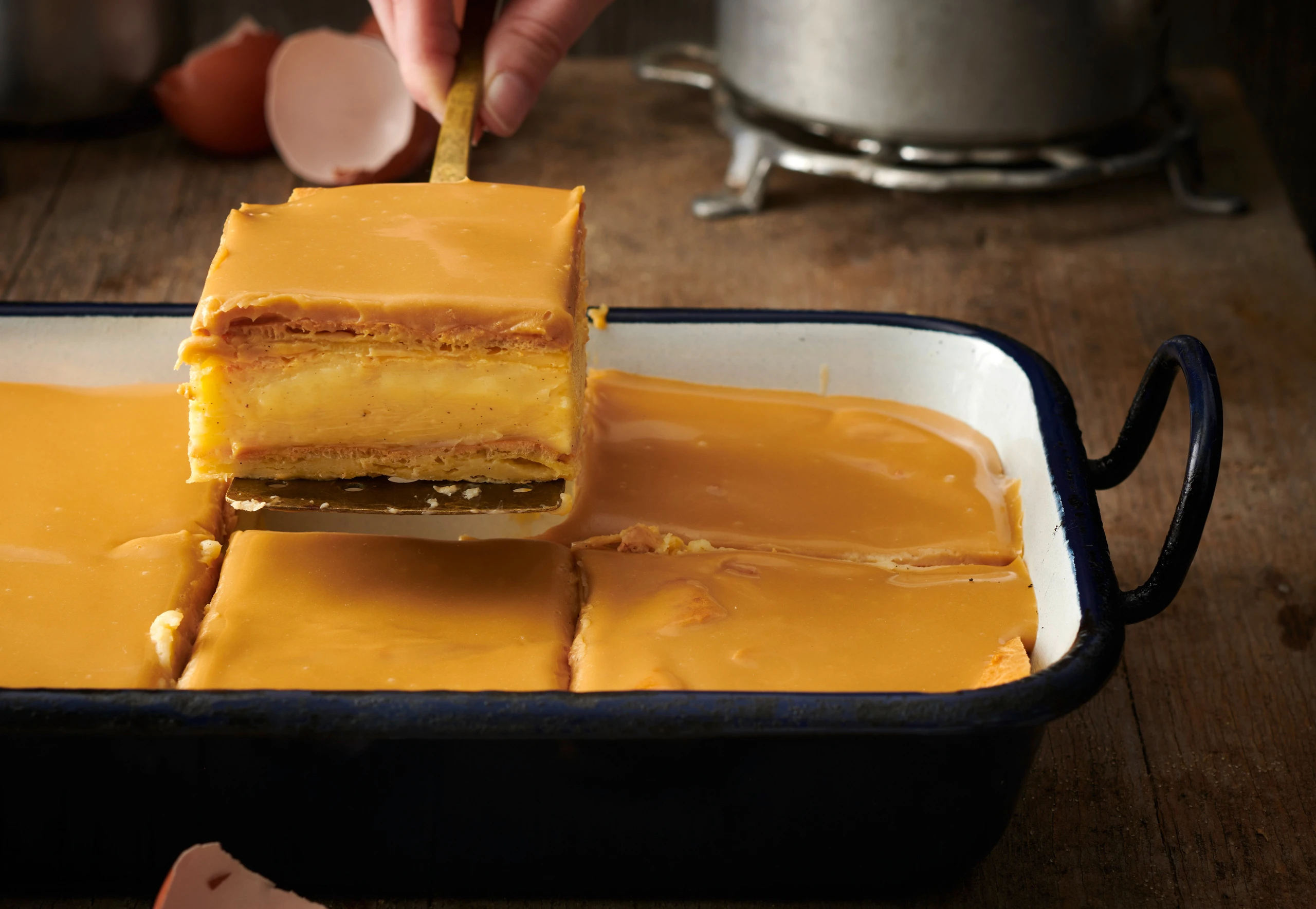 Einen Teigboden in die Form drücken. Ränder eventuell mit einem Messer begradigen. Creme darauf verstreichen. Zweiten Teigboden darauf legen und leicht andrücken. Kuchen kühl stellen.